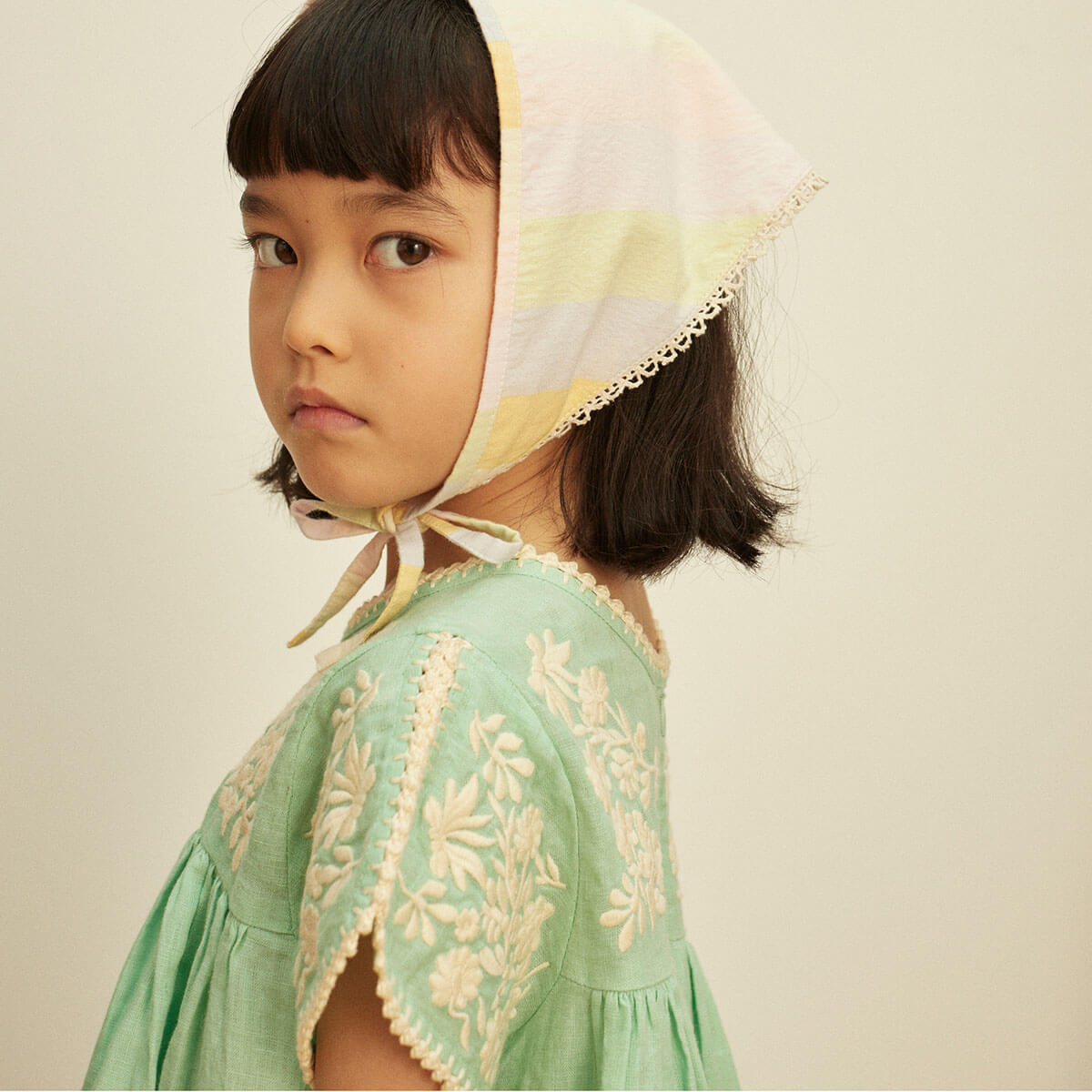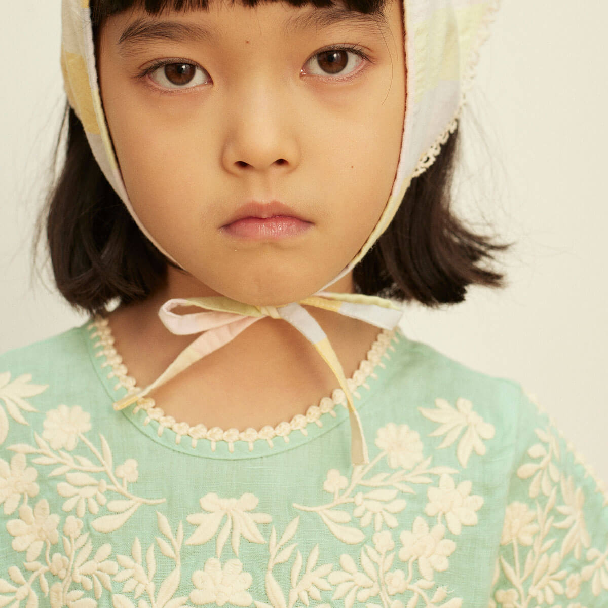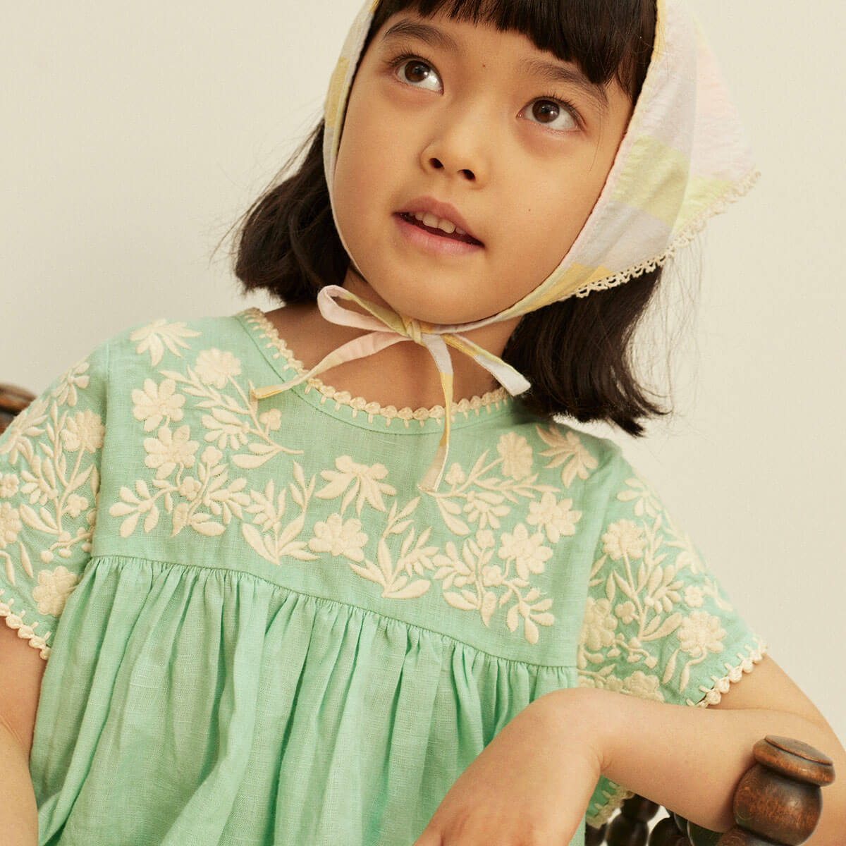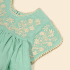 Stevie Blouse by Apolina. The beloved signature Stevie style is reimagined as a blouse in the season’s key highlight colour ‘seaglass’. Featuring Apolina’s classic folk-inspired contrast embroidery at chest, arms and hem, crochet trim at neckline, shoulder and armhole, and blanket stitch finish at hem. Invisible zip closure at back.