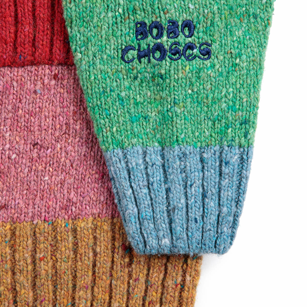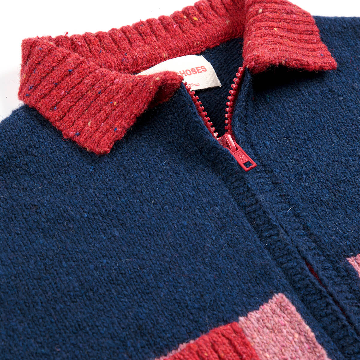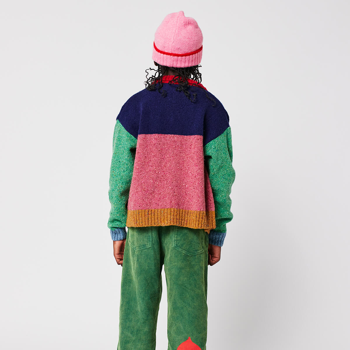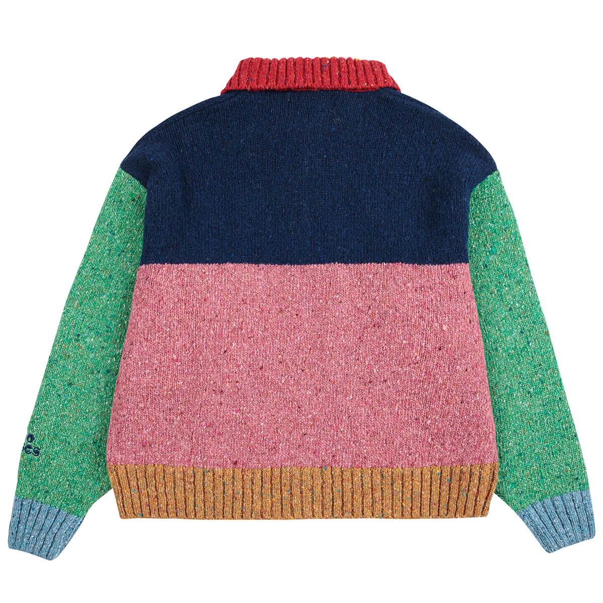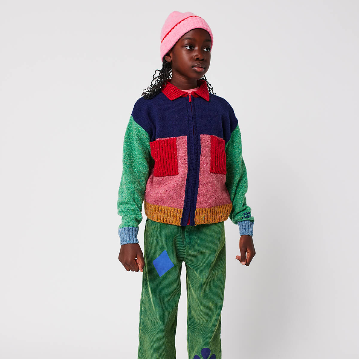 Bobo Choses Colour Block Cardigan by Bobo Choses. A stylish and cosy multicoloured wool cardigan, designed for those cooler days. This colour block cardigan features long sleeves, a flat collar, ribbed cuffs a patched chest pocket and front zip closure.