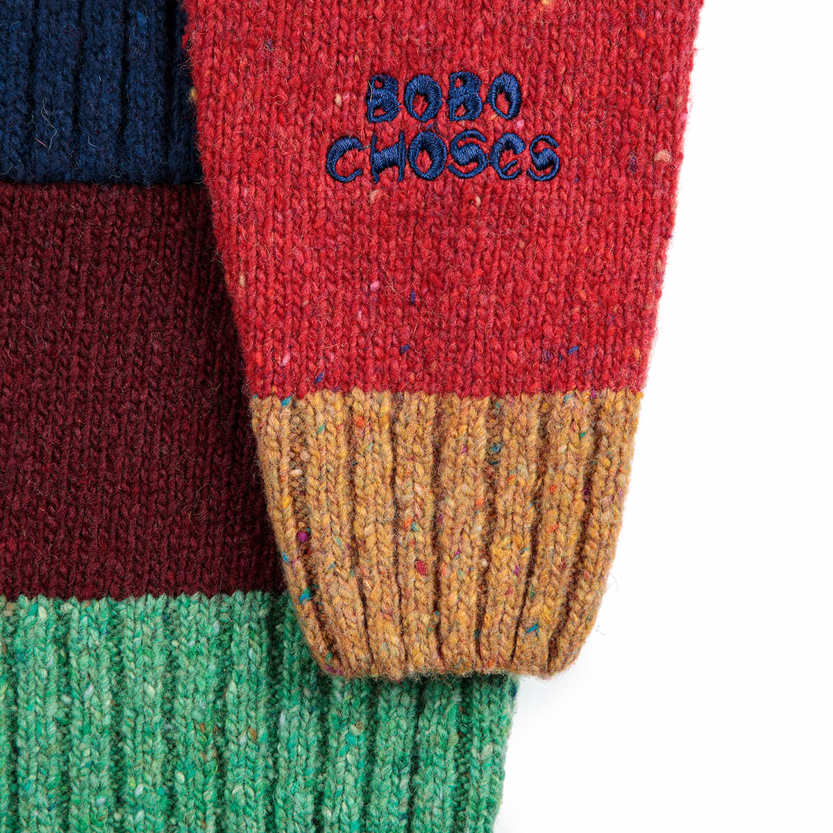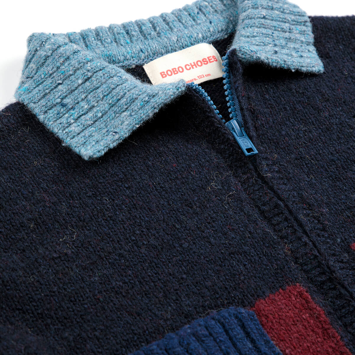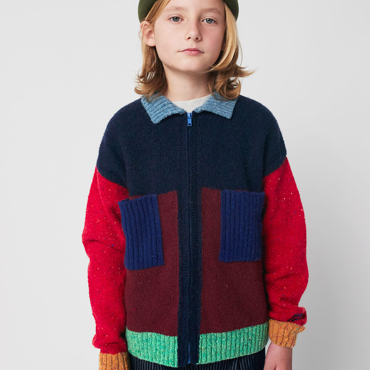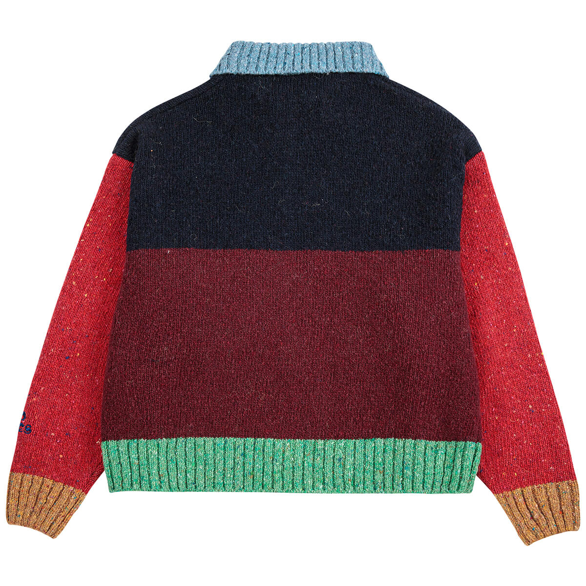 Bobo Choses Colour Block Cardigan by Bobo Choses. A stylish and cosy multicoloured wool cardigan, designed for those cooler days. This colour block cardigan features long sleeves, a flat collar, ribbed cuffs a patched chest pocket and front zip closure.