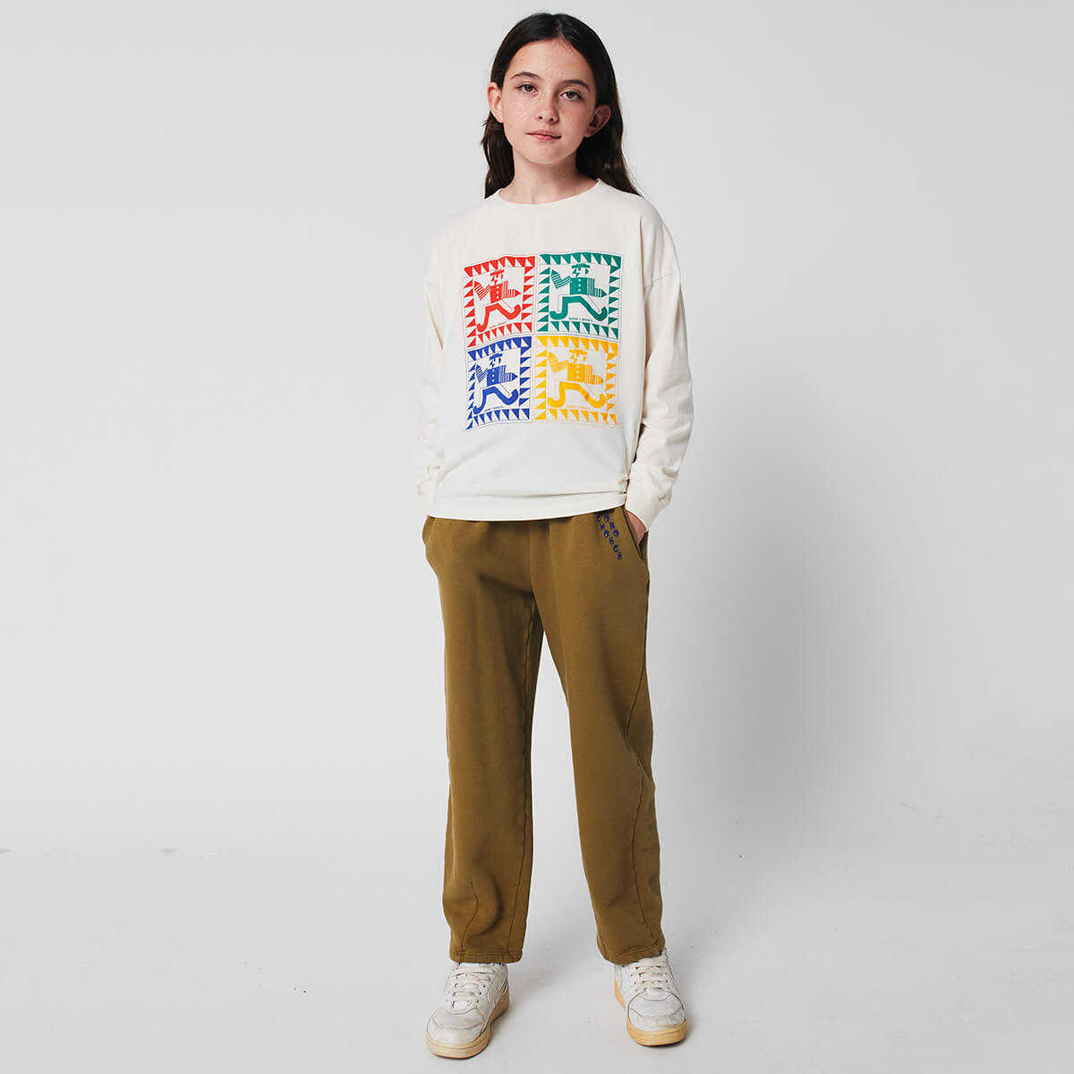 Bobo Choses Sweatpants by Bobo Choses. Understated and cosy, these khaki joggers are a comfortable choice for those cooler days. Made from 100% organic cotton, featuring a patch pocket, seam pockets, a cocoon fit and an elasticated waistband with adjustable drawstring.