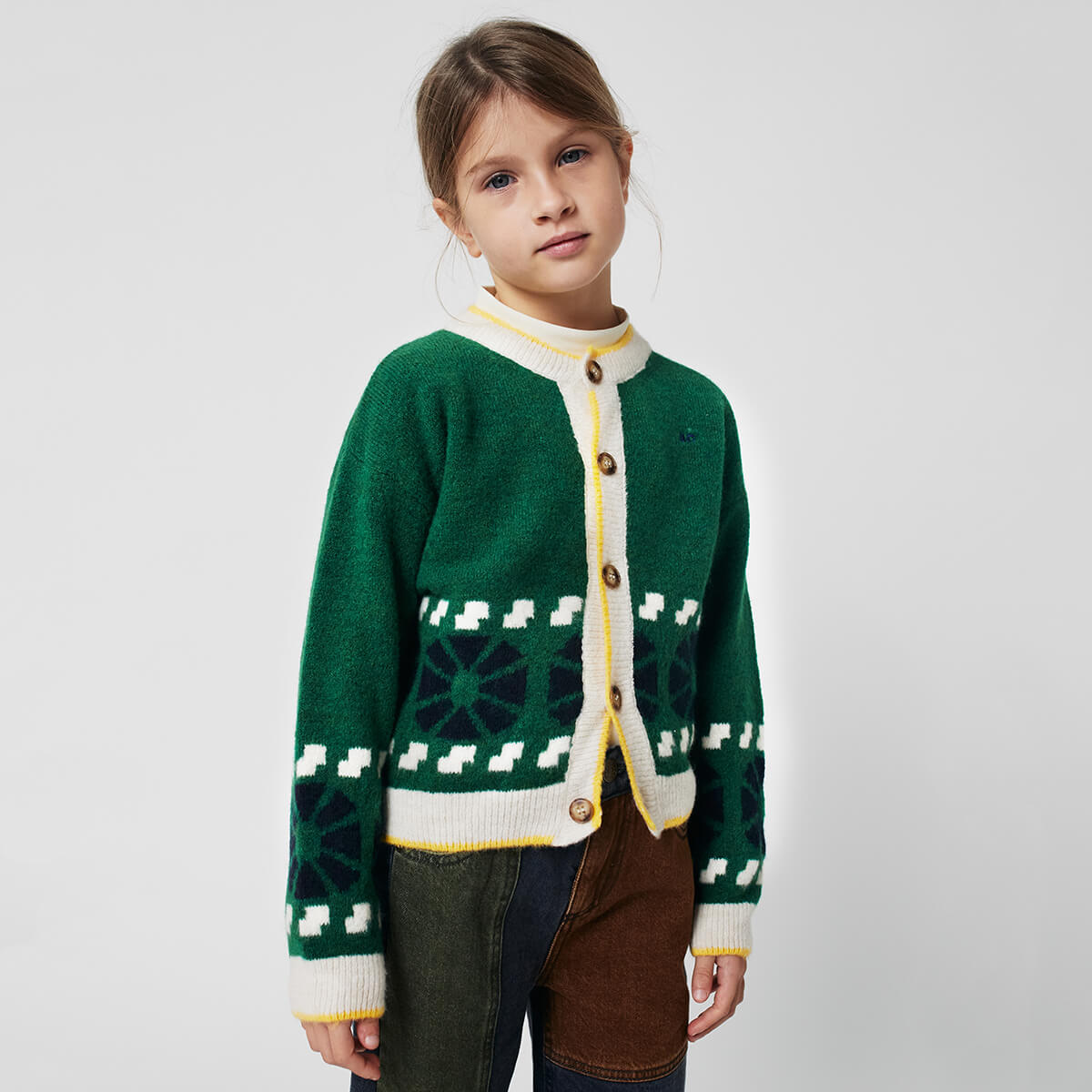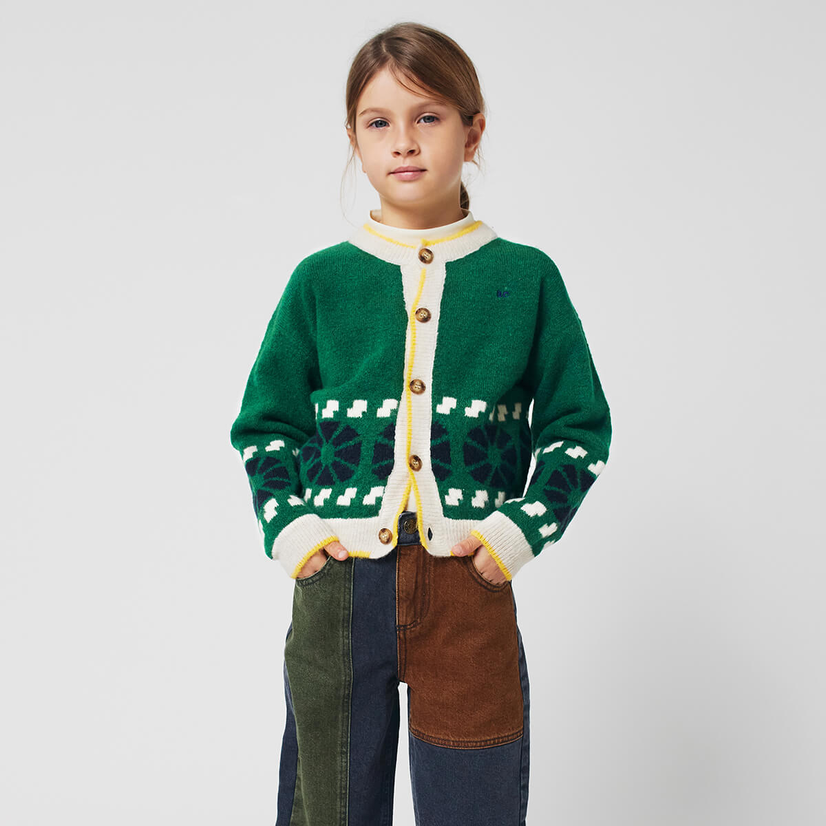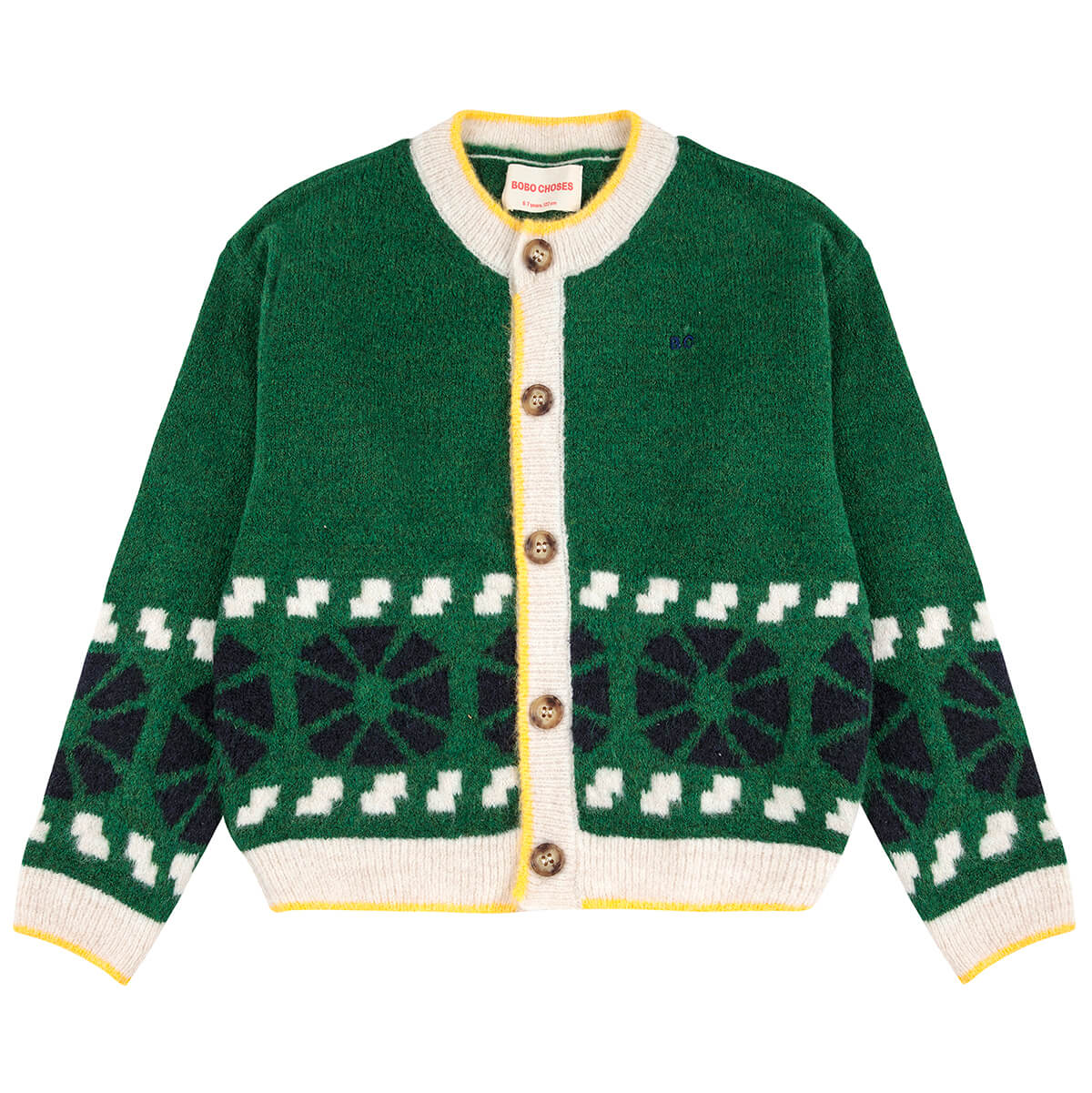 Kaleidoscope Jacquard Cardigan by Bobo Choses. A cosy and stylish green cardigan, the perfect addition to any winter look. This chunky knit cardigan features long sleeves, a crew neck, ribbed cuffs and front button fastening.