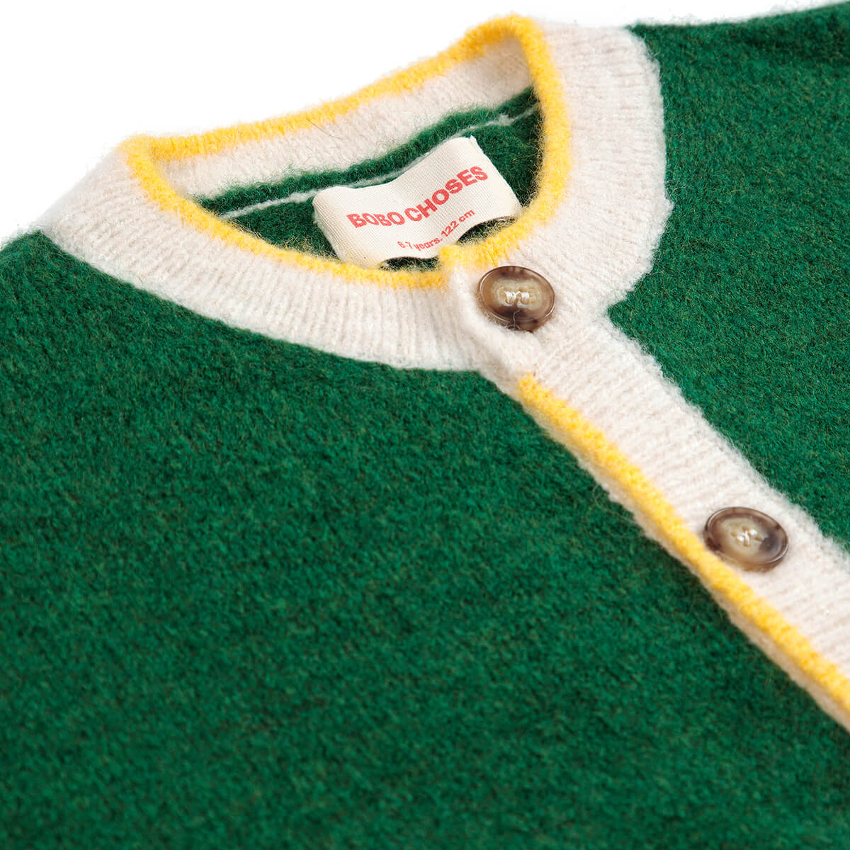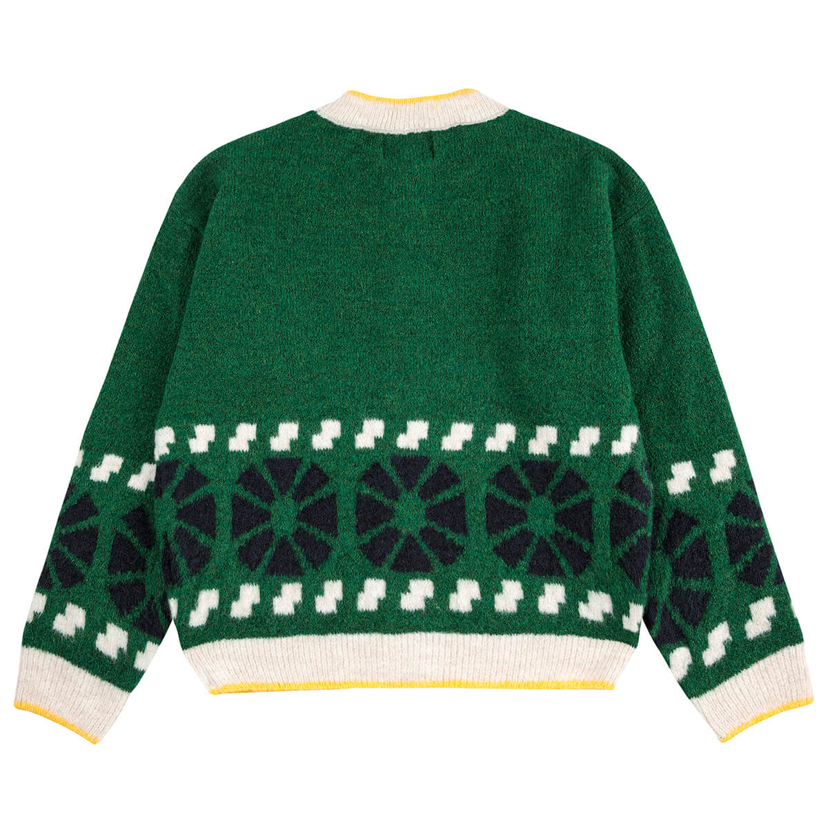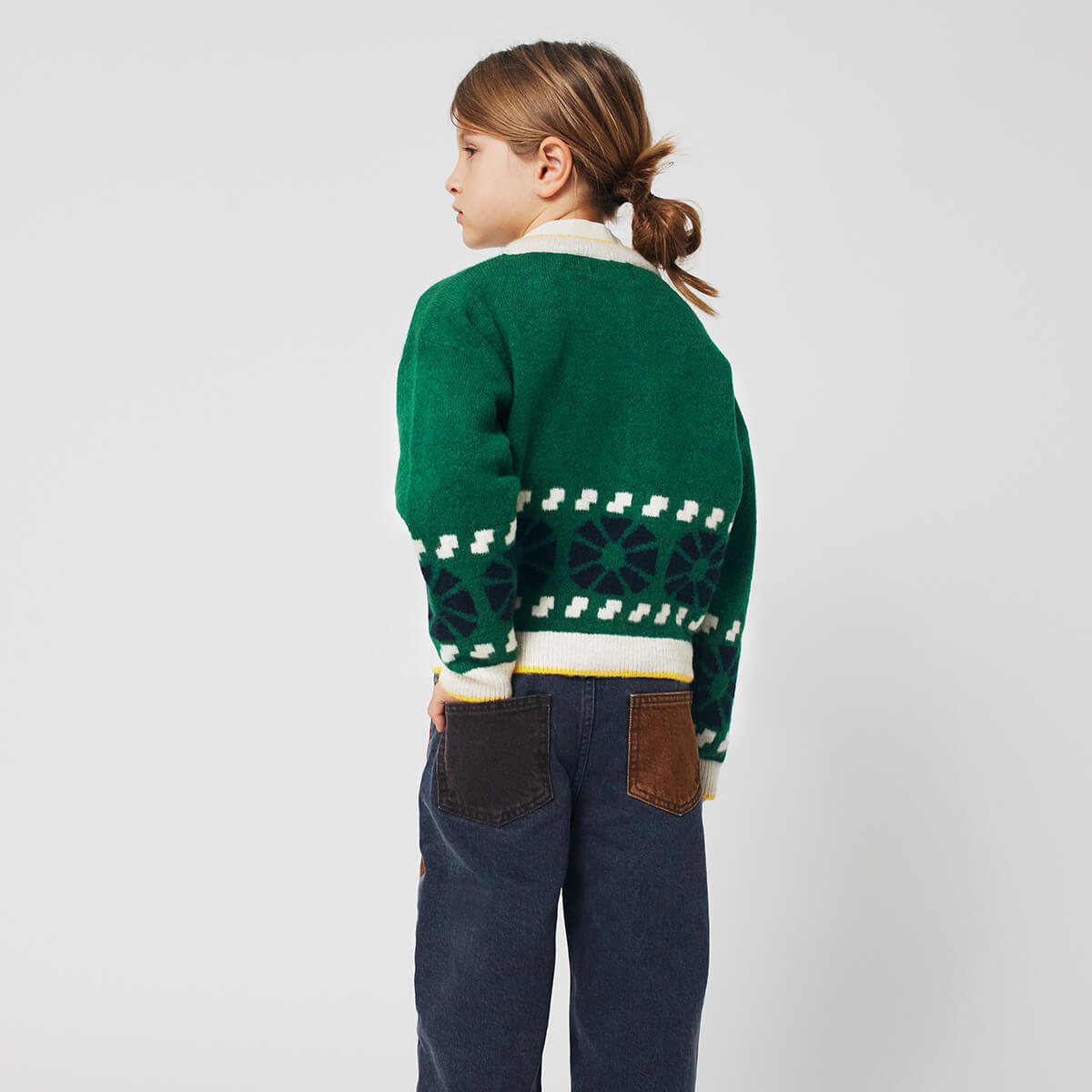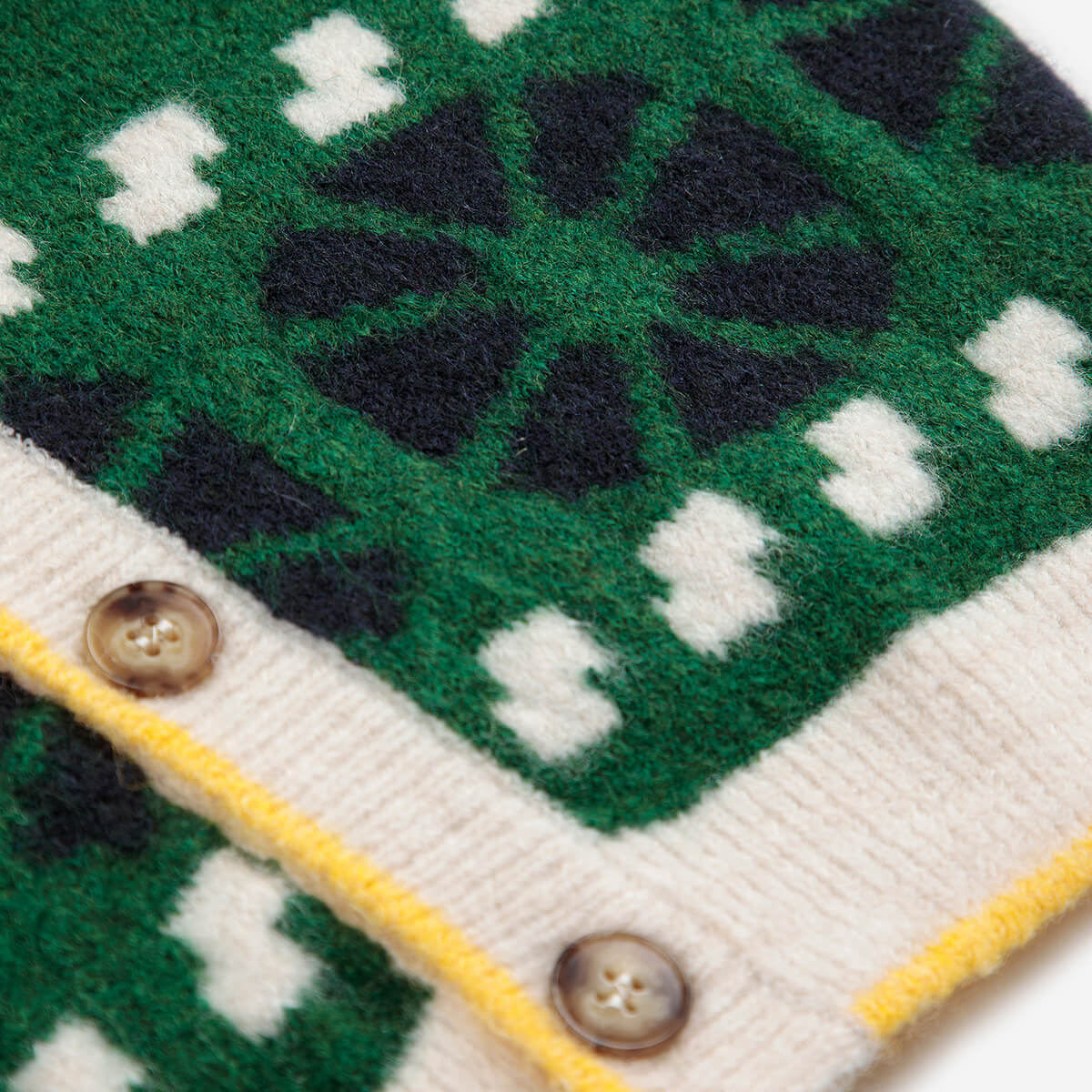 Kaleidoscope Jacquard Cardigan by Bobo Choses. A cosy and stylish green cardigan, the perfect addition to any winter look. This chunky knit cardigan features long sleeves, a crew neck, ribbed cuffs and front button fastening.