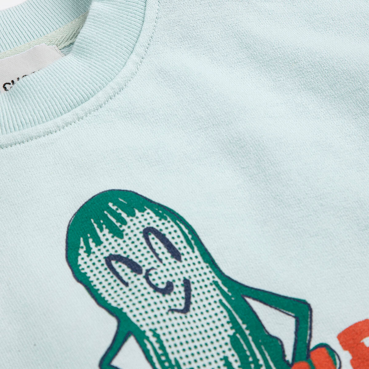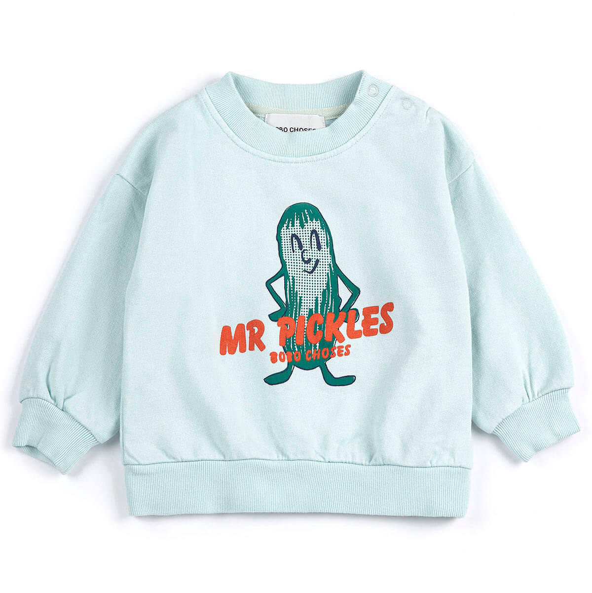 Mr Pickles Baby Sweatshirt by Bobo Choses. Light blue sweatshirt featuring a playful mr pickles print. Designed with long sleeves, dropped shoulder, shoulder snap fastening, ribbed cuffs, loose fit, ribbed bottom and a round neck.
