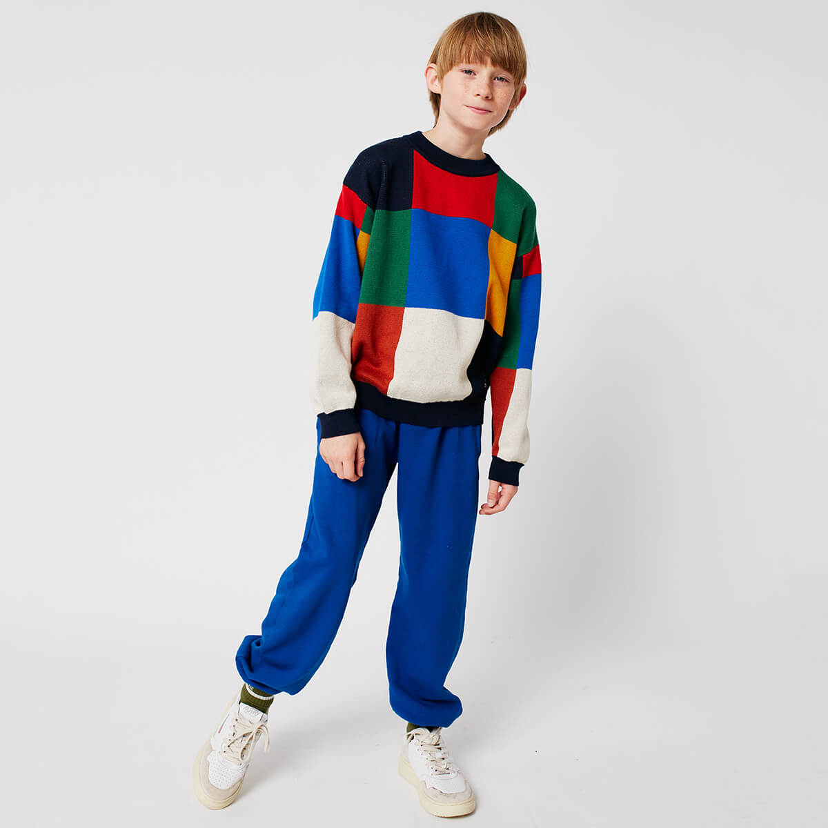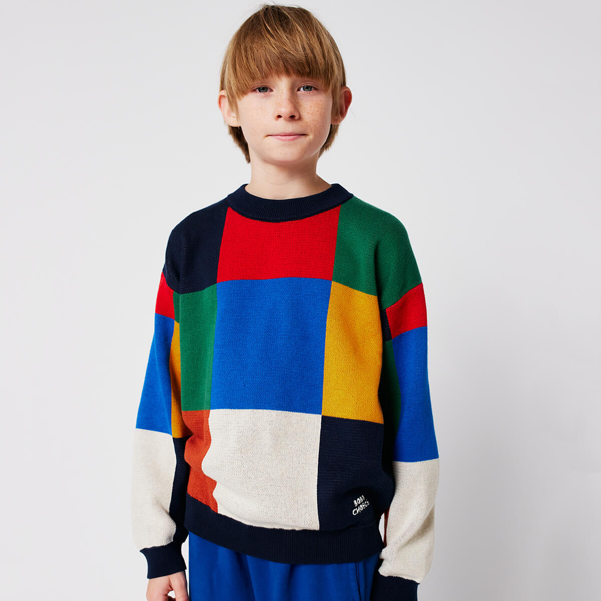 Multicolour Tiles Jumper by Bobo Choses. A playful multicoloured knit sweater designed for those cooler days. Crafted from 100% organic cotton this tiles jumper features long sleeves, a crew neck, ribbed cuffs and a loose fit, for all-day comfort.