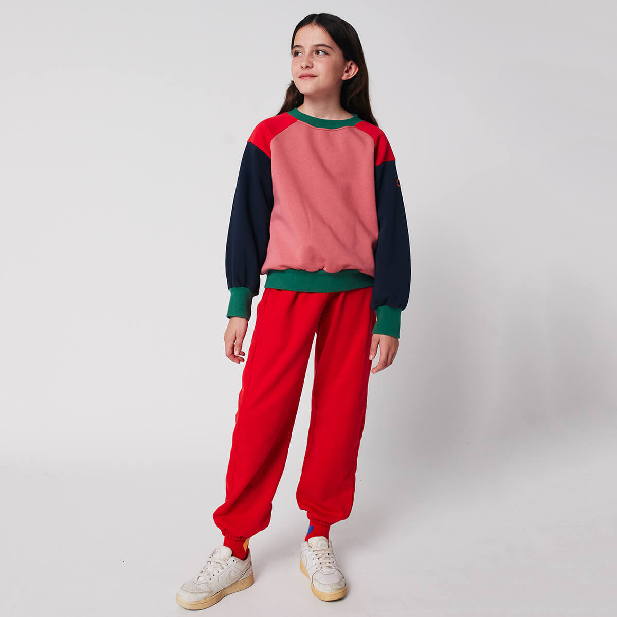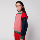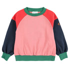 Tic Tac Toe Colour Block Sweatshirt by Bobo Choses. Bold and sporty this pink sweatshirt is a stylish choice for those cooler days. Made from 100% organic cotton, it's designed to bring style and comfort. It features long raglan sleeves, inner brush fleece, ribbed cuffs and a ribbed bottom for added comfort.