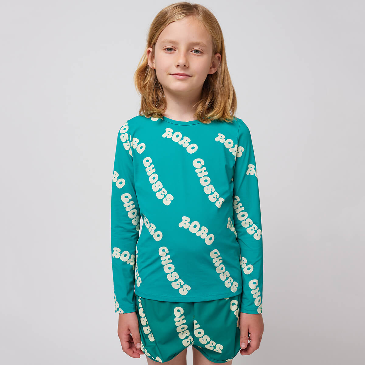 Wavy Bobo Choses All Over Swim T Shirt by Bobo Choses. Streamlined and sleek, this green swimwear is ideal for active days. It features long sleeves, a slim fit, and a round neck. Crafted with care in Spain.