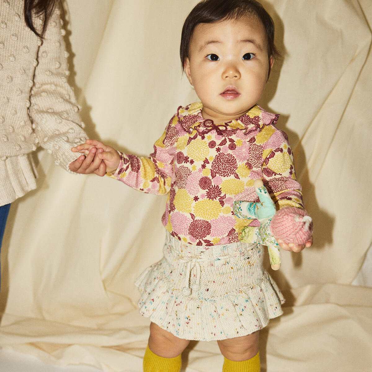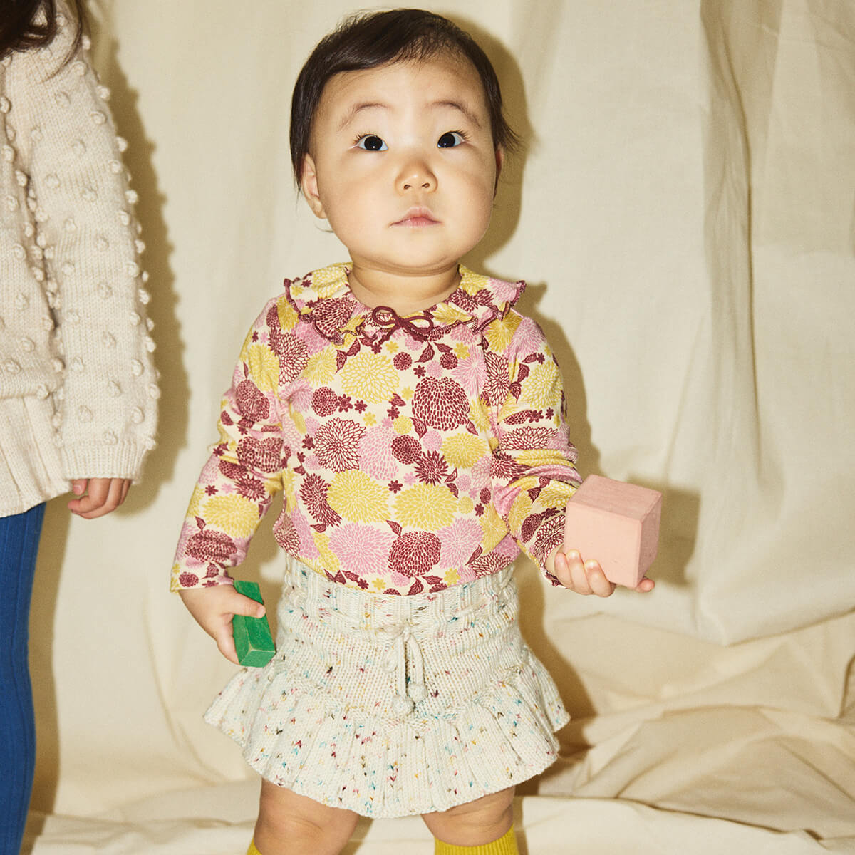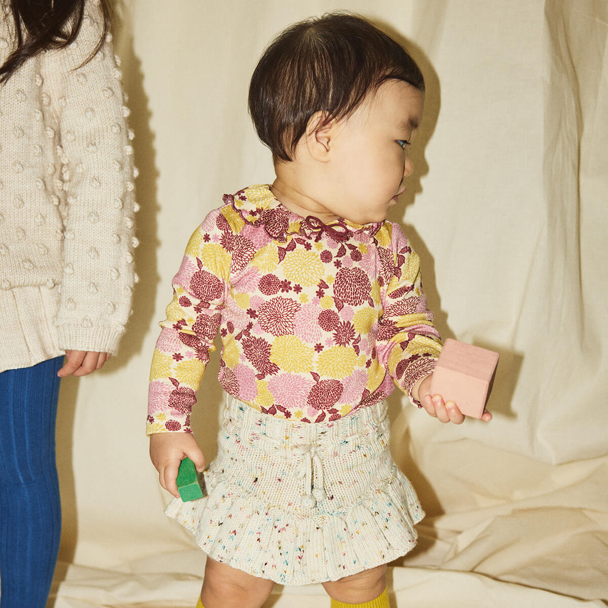 Pattie Onesie by Misha & Puff. A long-sleeved onesie in organic Pima cotton, featuring a ruffle collar with a contrast merrowed edge and mini bow. Finished with snap closure at the bottom and back neck — perfect on its own or layered for a versatile, buildable look.