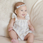 Bonnie Romper by Quincy Mae. The Bonnie romper features ruffle shoulder straps, an elastic back and neckline, elastic leg openings, and a bottom snap closure for easy changes and a perfect fit.