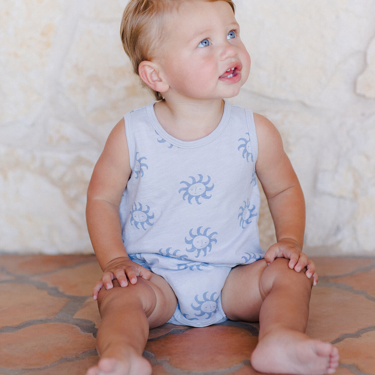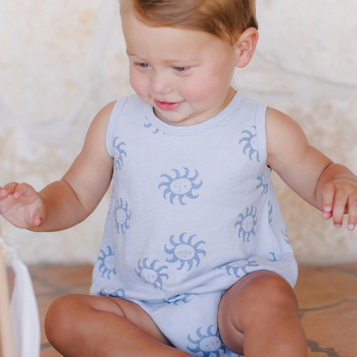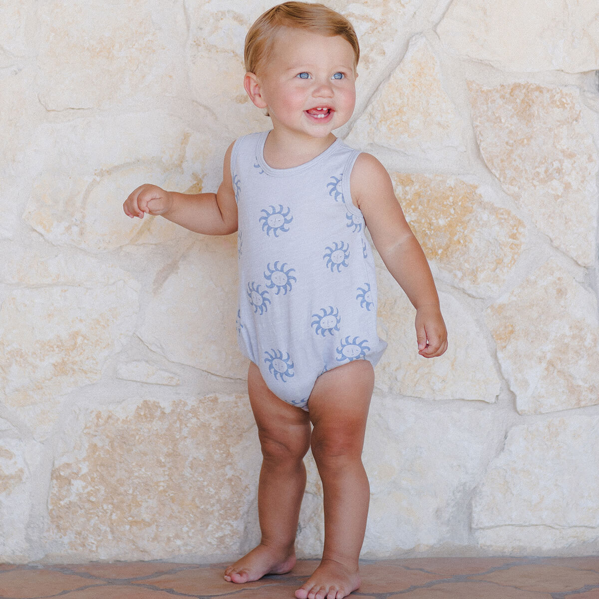 Bubble baby onesie by Rylee & Cru. This easy-to-wear sleeveless onesie is made of soft cotton jersey and features snaps on bottom and back for easy changes.