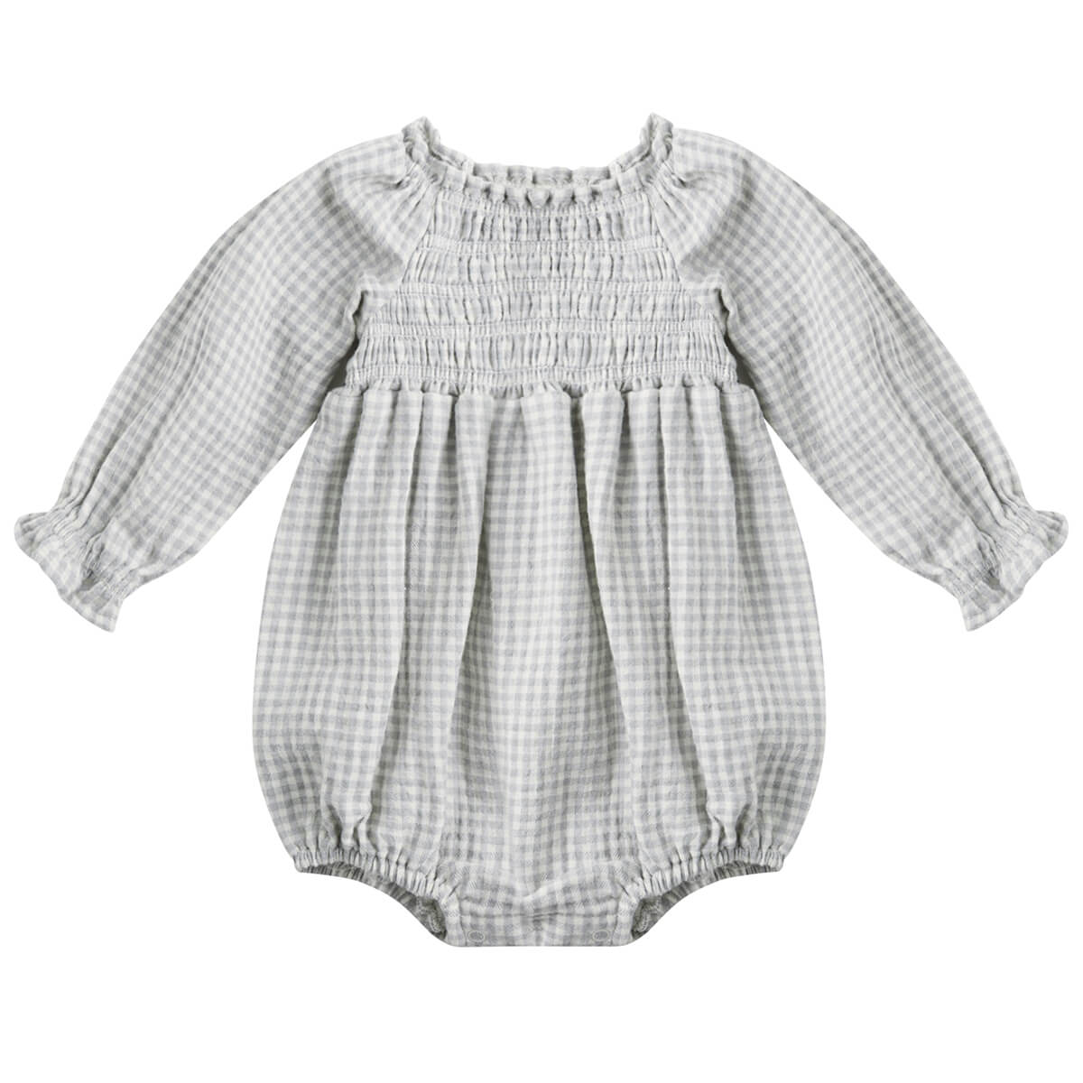 Eden Romper by Quincy Mae. Long sleeve romper featuring delicate smocking across the chest, gathered ruffle details at the wrists, and a sweet ruffled neckline, an effortlessly charming piece for your little one.