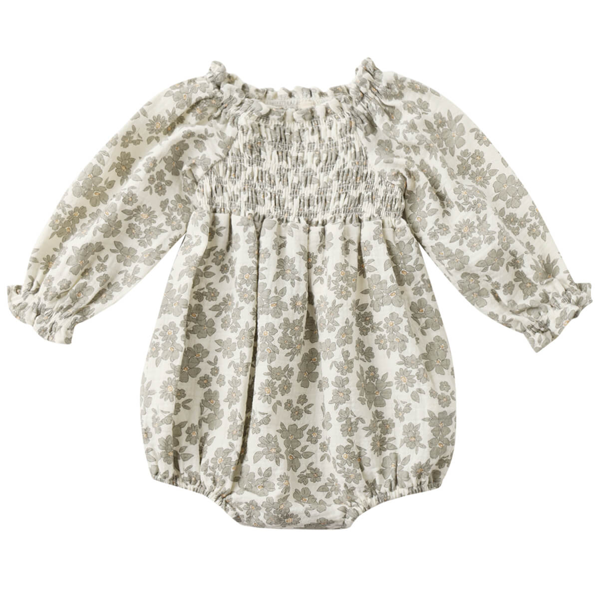 Eden Romper by Quincy Mae. Long sleeve romper featuring delicate smocking across the chest, gathered ruffle details at the wrists, and a sweet ruffled neckline, an effortlessly charming piece for your little one.