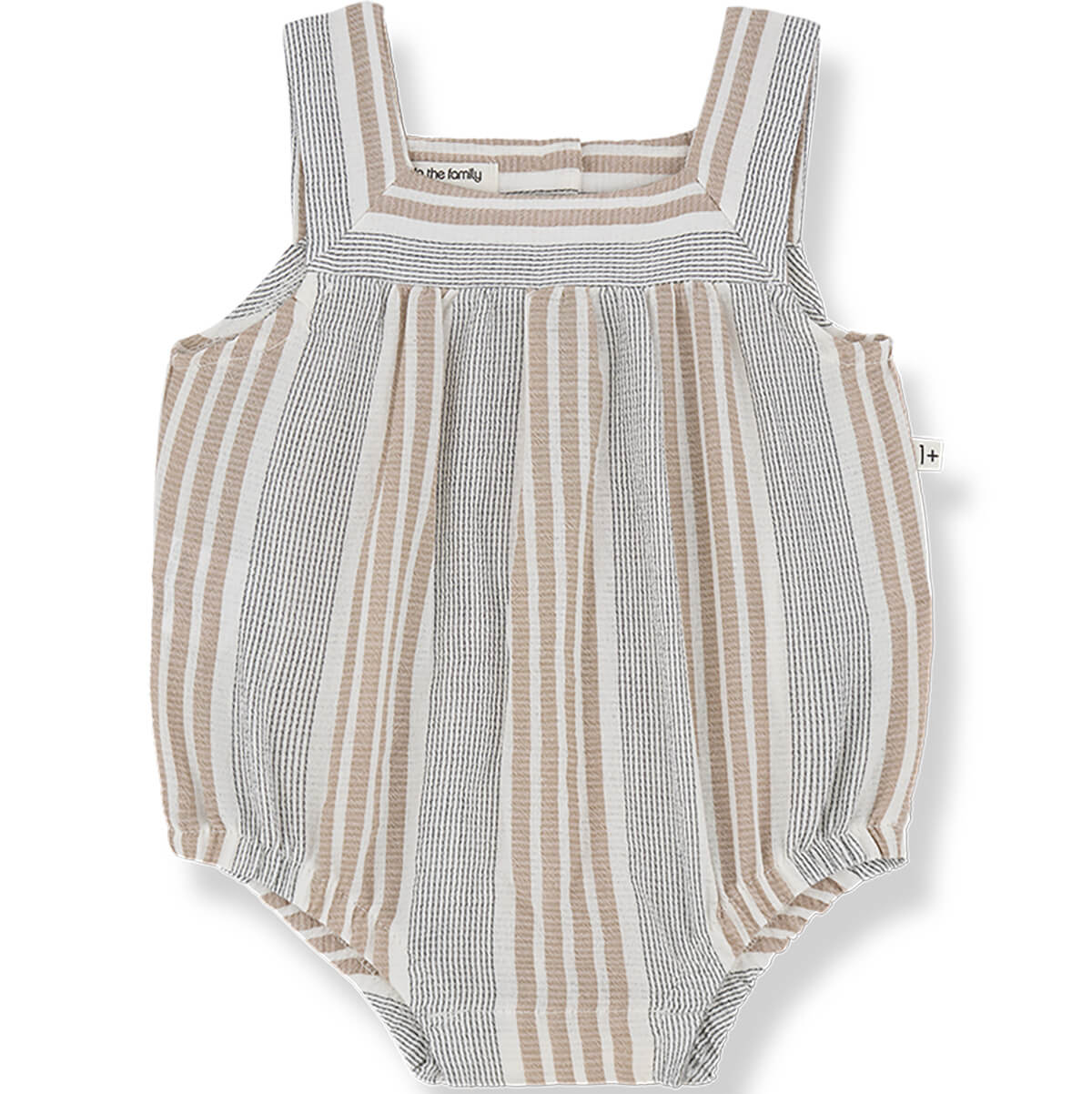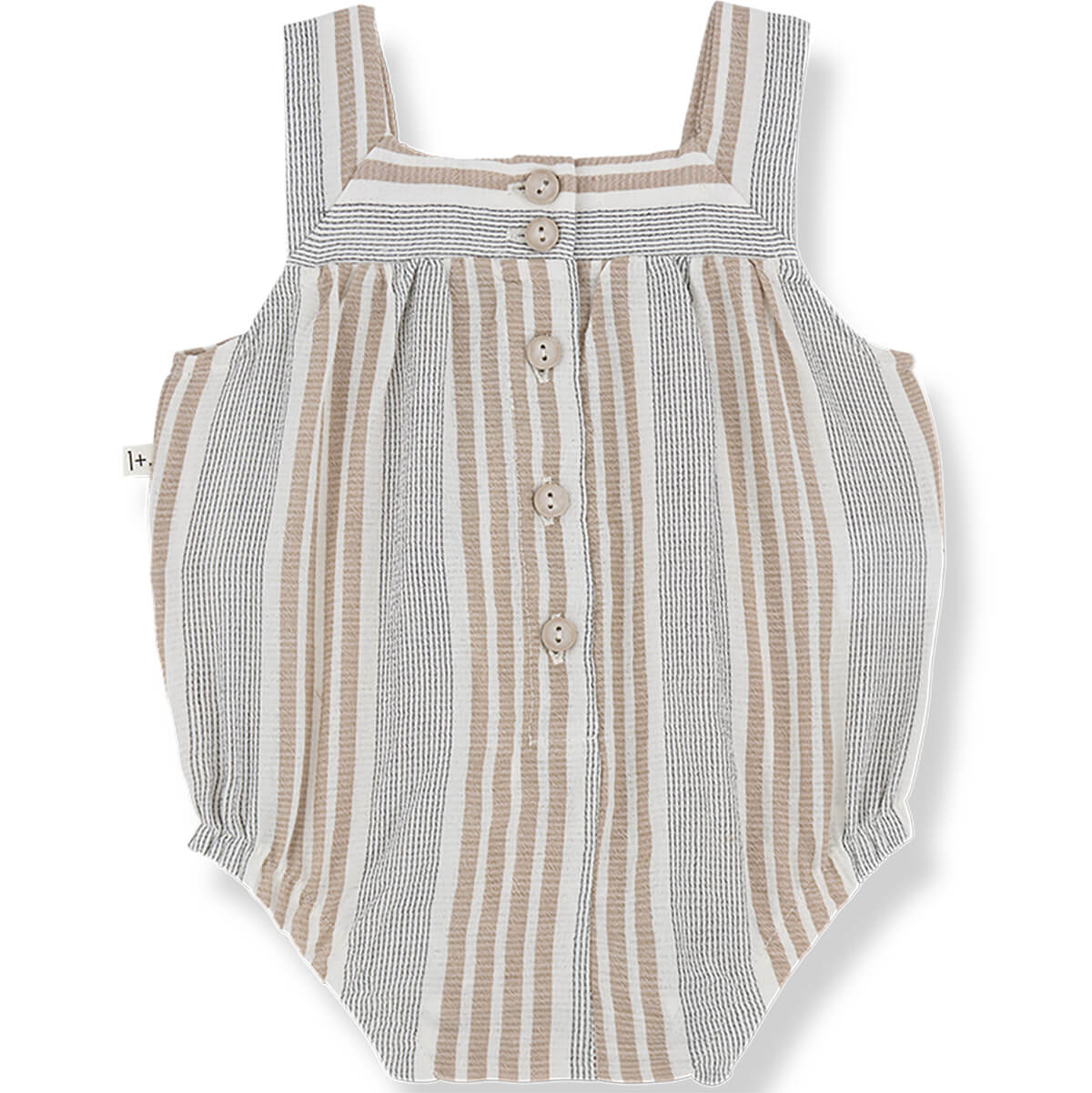 Eren Romper by 1+ in the Family. Woven baby romper in a soft mattress striped pattern fabric.