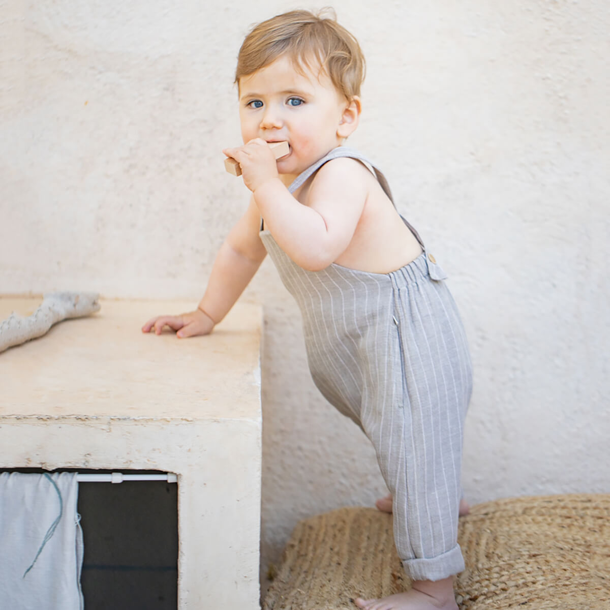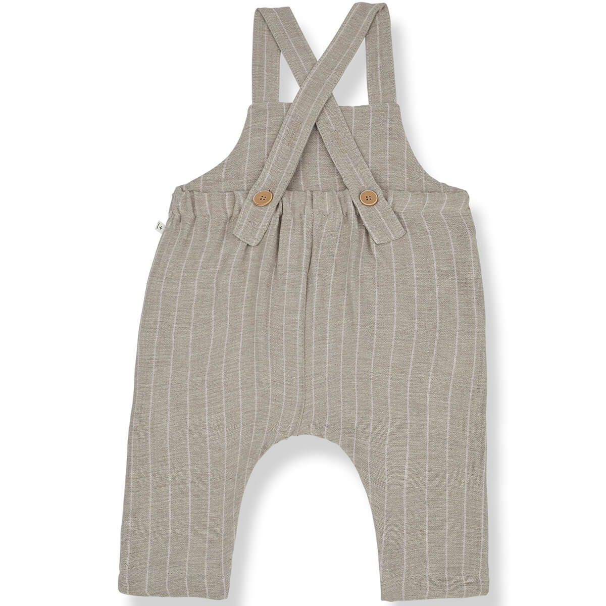 Ettore Overall by 1+ in the Family. Sweet baby dungarees in a diplomatic stripes double face fabric. With wooden button fastenings.
