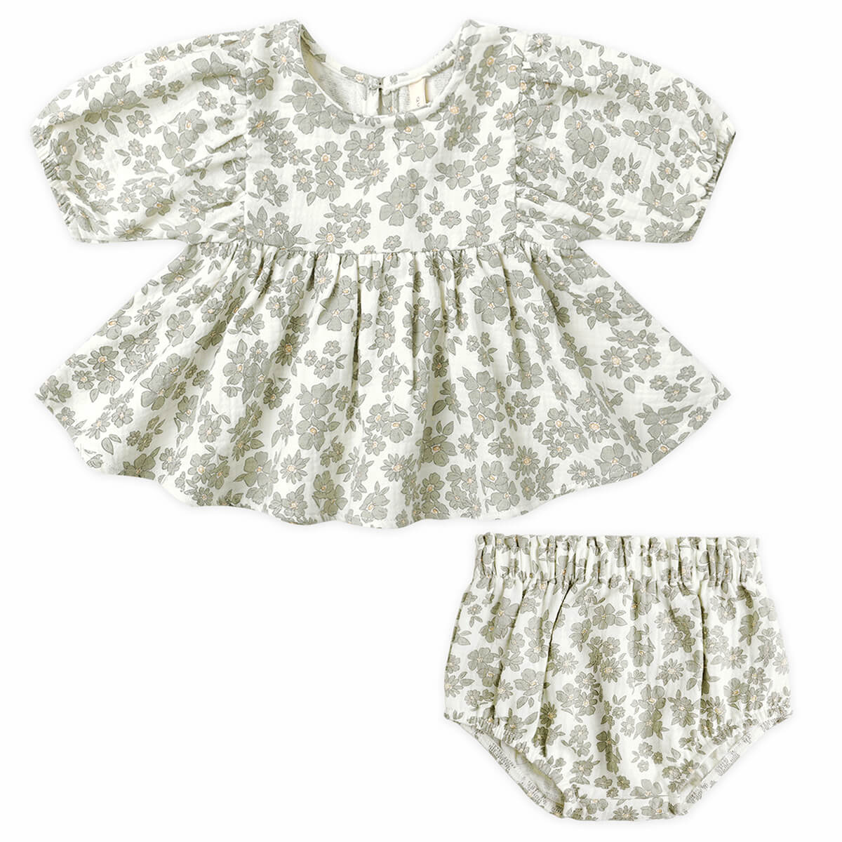 Francy Set by Quincy Mae. The Francy set features a sweet empire waist top with balloon sleeves and a back keyhole with a coconut button, paired with matching gathered bloomers for an effortlessly charming look.
