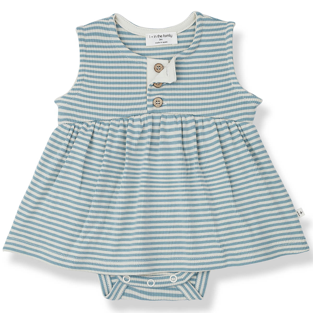 Lirica Romper by 1+ in the Family. Sweet baby romper dress in a striped rib jersey fabric. With wooden button and snap button fastenings.