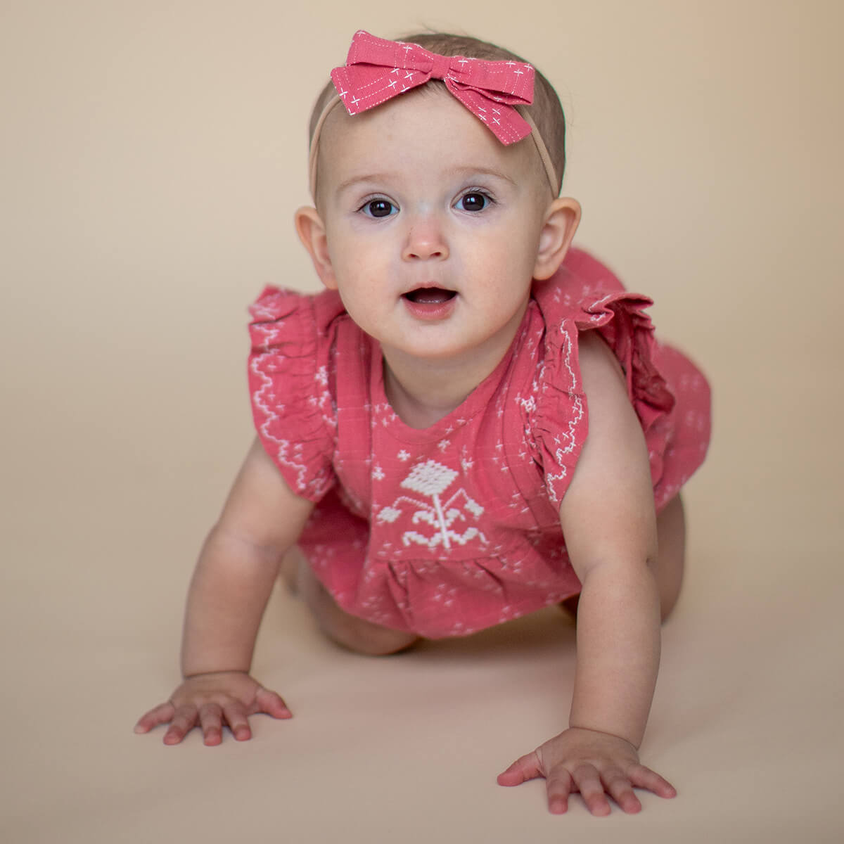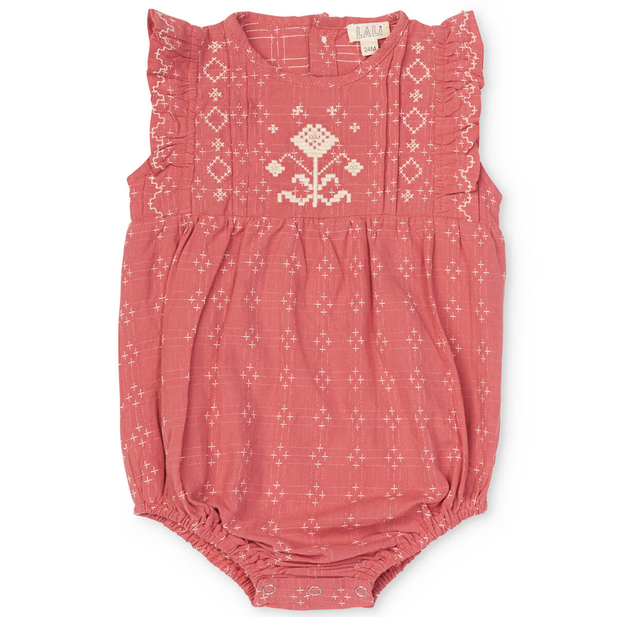 Little Floral Romper by Lali. The Little Flora Romper in Coral Crossstitch is a perfect addition to your baby's wardrobe with its easy, throw on-and-go delight. Made from custom woven 100% cotton in medium weight, Little Flora features special details of playful ruffles, ample gathers and exquisite embroidery. Her generous cut through the body encourages movement and play, along with bottom snaps. The garment has a mother-of-pearl back button closure and gentle elastic leg openings.