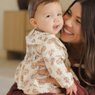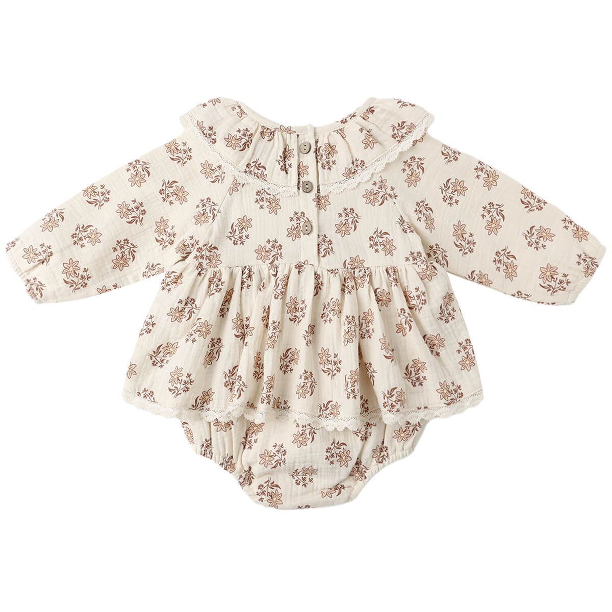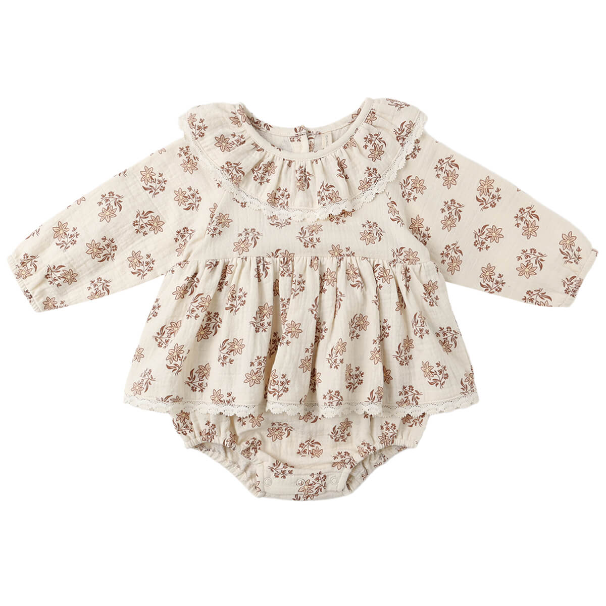 Thalia Romper by Quincy Mae. Long sleeve romper featuring a sweet collar, delicate lace trim, a gathered waist, coconut buttons down the back, and bottom snaps for easy changes.