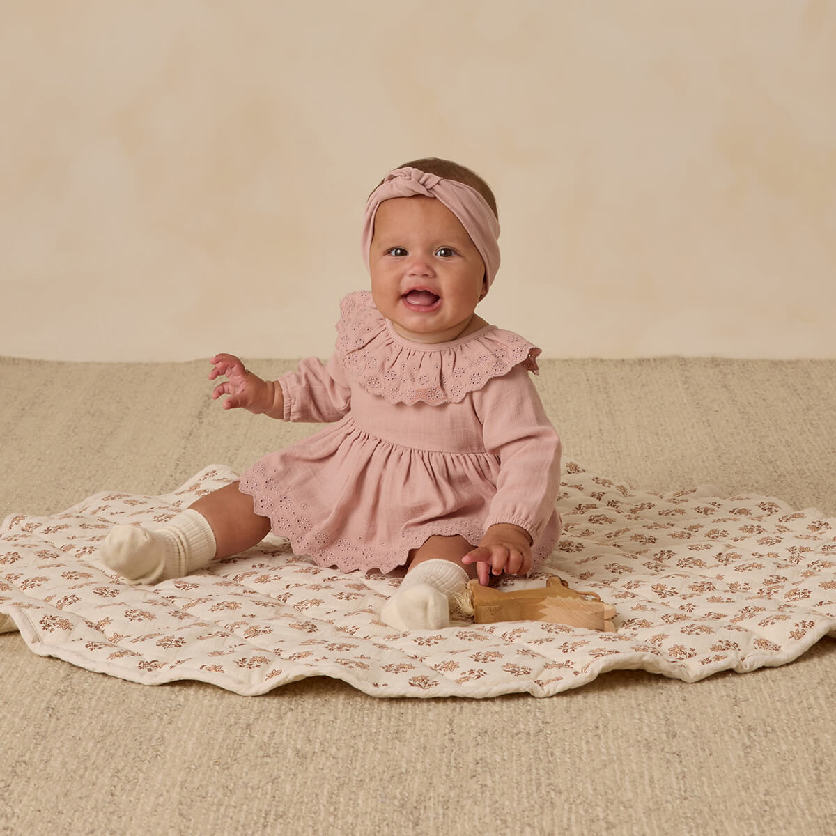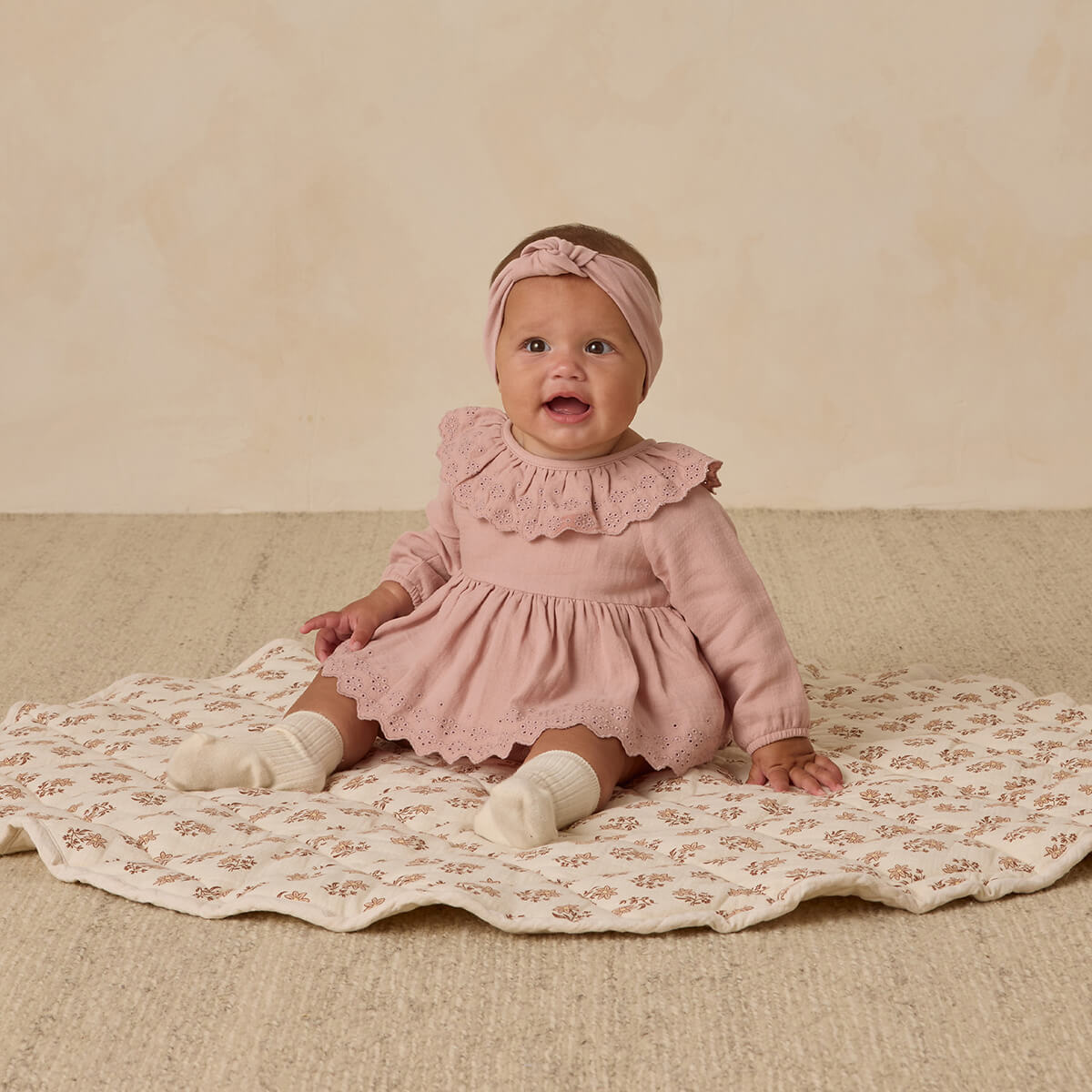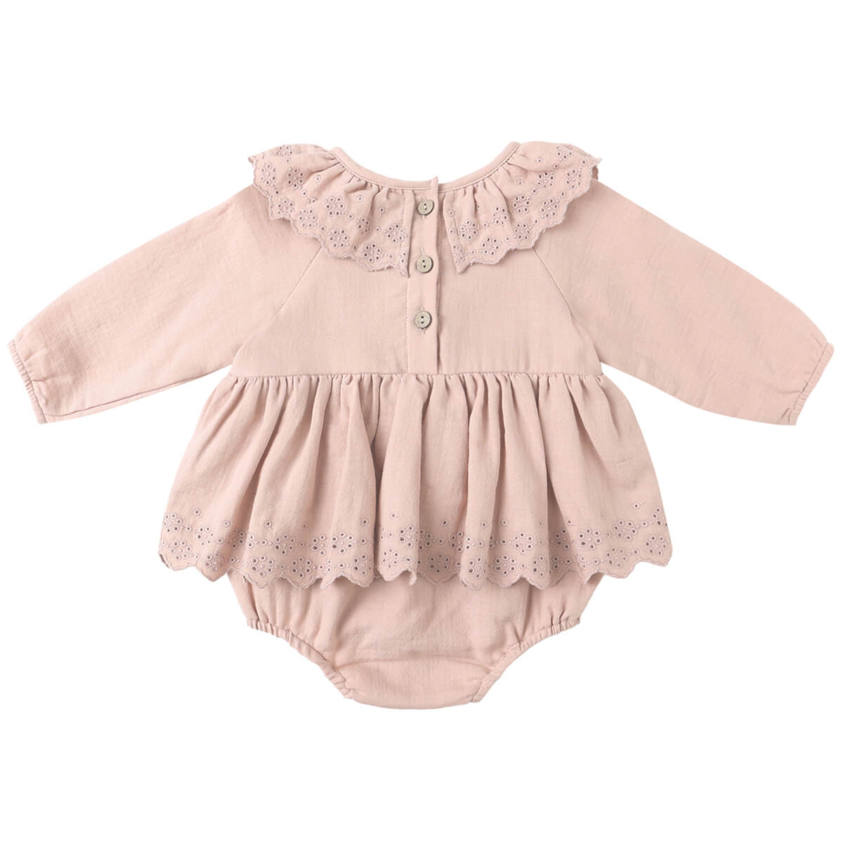 Thalia Romper by Quincy Mae. Long sleeve romper featuring a sweet collar, embroidered detail, a gathered waist, coconut buttons down the back, and bottom snaps for easy changes.