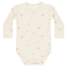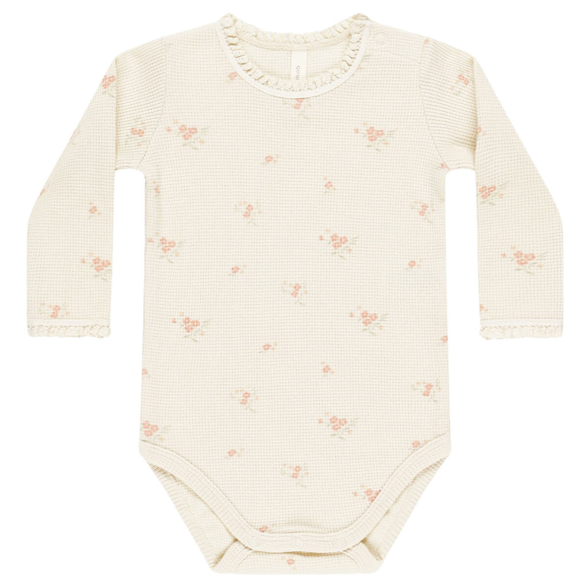 Waffle Long Sleeve Bodysuit by Quincy Mae. Long sleeve onesie in lightweight waffle knit. Designed with shoulder and bottom snaps for easy changes and the sweetest crochet lace ruffle detail.