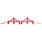 Double Suspension bridge by Brio. This is the longest bridge in the BRIO World railway system measuring 1134mm. It stands high enough for trains, boats and other vehicles to pass underneath it and offers extreme stability thanks to the wide integral bridge supports. Add two ascending tracks to the bridge to create two smaller bridges or try a different connecting track in the middle of the bridges to create new designs. This vibrant red railway bridge is a brilliant addition to any wooden train set.