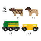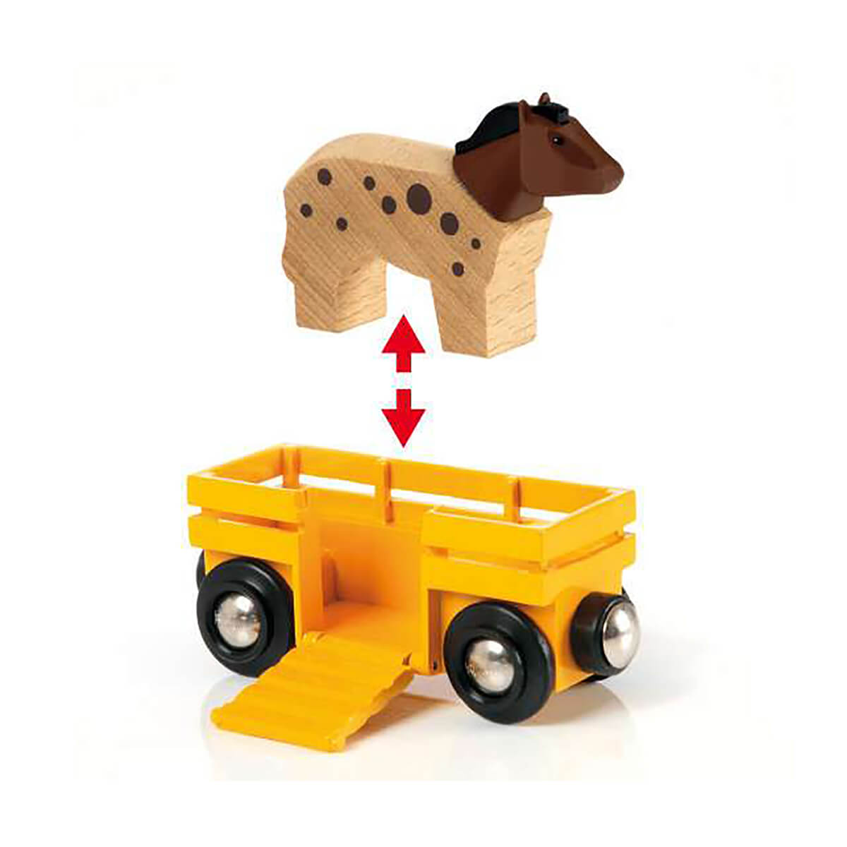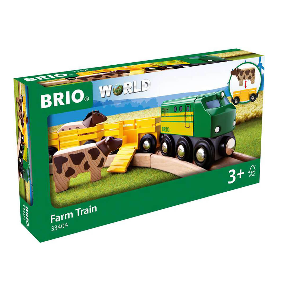 Farm train set by Brio. The horse and the cow need to be moved out to the pasture. Help them onboard the Farm Train by folding down the ramp, then transport the wooden animals safely around your BRIO World railway using the magnetically connected train and wagons. No animals will have to feel crowded on this journey as each will have their own wagon. Let the engine pull them along to their next stop as they enjoy the countryside air.
