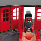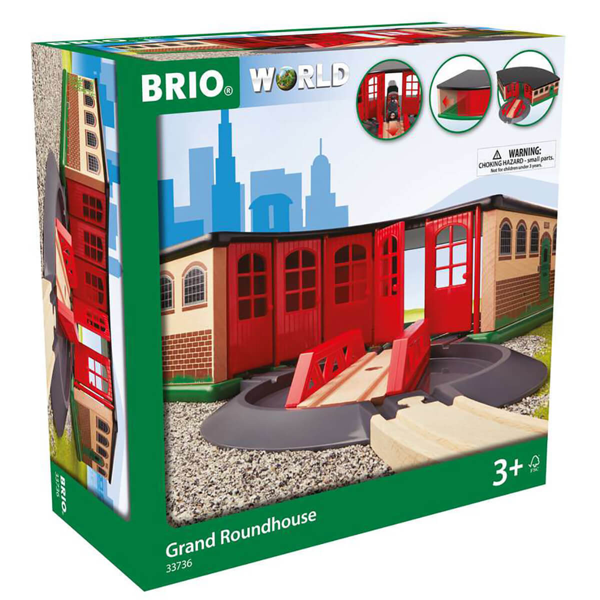 Grand roundhouse by Brio. It’s time to put the trains to bed. The Grand Roundhouse is a great addition to any BRIO World railway layout, with beautifully realistic graphics and enough space to fit five trains. The sturdy roundhouse has five entrances on the front with an easy-to-use turntable to help guide trains in. There are also two large sliding doors on the rear of the roundhouse so that you can easily reach the sleeping trains.