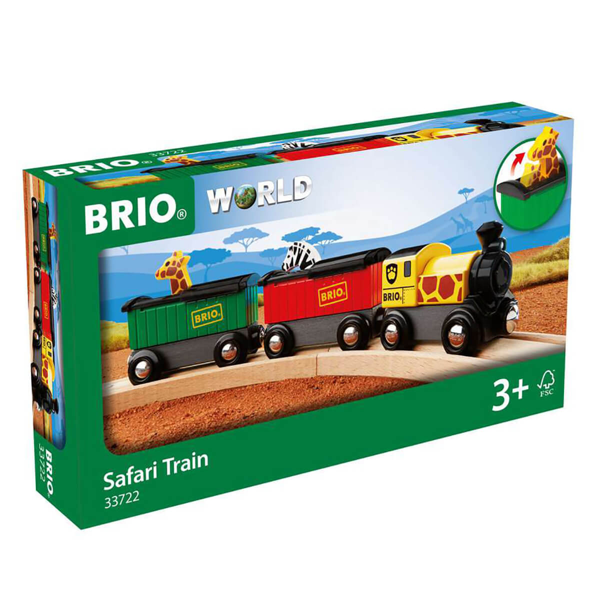 Safari train by Brio. All aboard for the safari! The set comes with one yellow engine with fun safari print and two wagons carrying the attached giraffe and zebra. Slide the wagon roof open and the safari animals will quickly pop their heads up to say hi. Slide the roof closed again and they’ll tuck back down into the wagon.