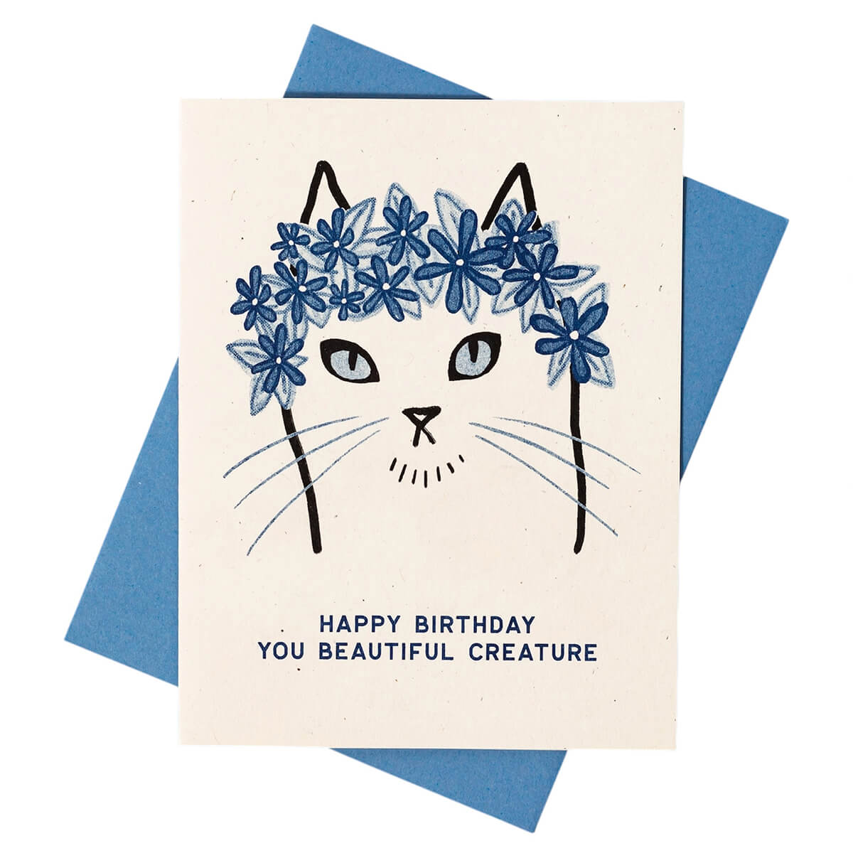 Beautiful Creature Birthday Greetings Card by Bromstad Printing Co. This birthday card is for that special one who radiates beauty inside and out. Happy birthday, you beautiful creature. Risograph printed in federal blue and black ink featuring a cat wearing a whimsical flower crown.