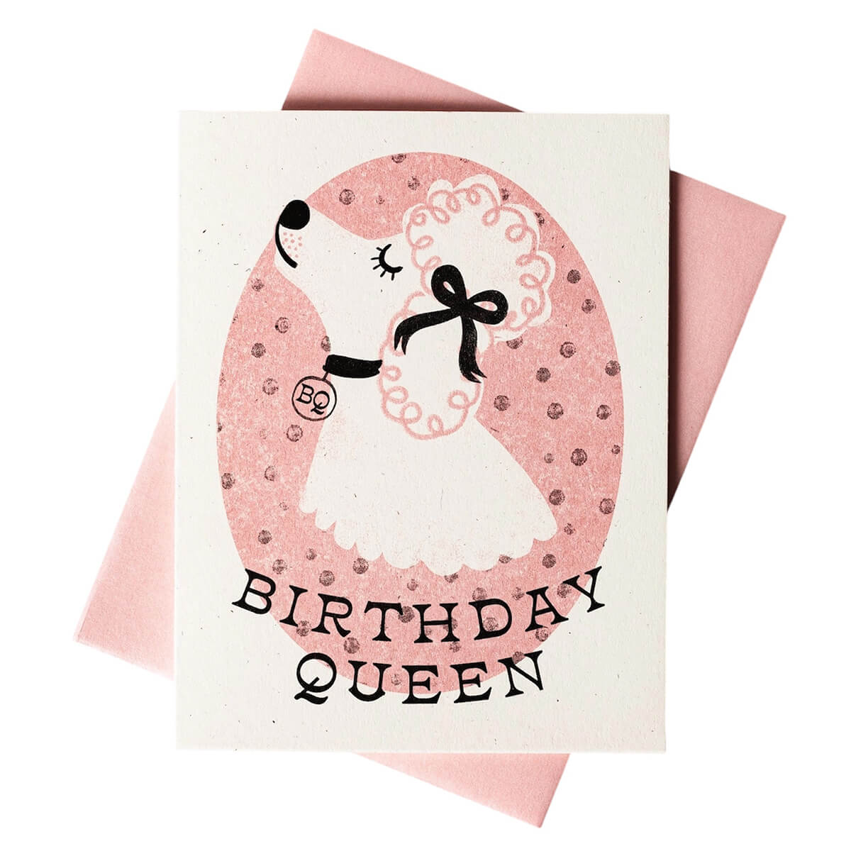 Birthday Queen Greetings Card by Bromstad Printing Co. A prissy poodle is gussied up for her birthday! She's a queen! Risograph printed in light mauve and black.