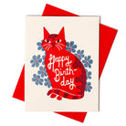 Happy Birthday Greetings Card by Bromstad Printing Co. This agreeable red cat sits among pretty blue flowers to wish you a happy birthday. Risograph printed in federal blue and bright red.