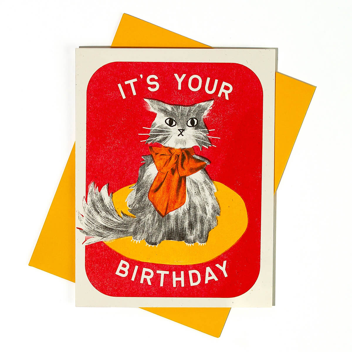 It's Your Birthday Greetings Card by Bromstad Printing Co. Get ready to get gussied up because it's your birthday! A fluffy cat wears a big old bow to celebrate. Risograph printed in black, bright red, and sunflower yellow.