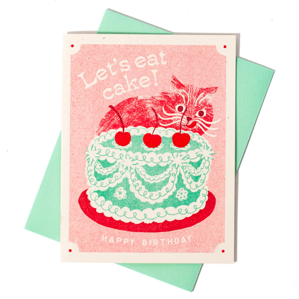 Let's Eat Cake Birthday Greetings Card by Bromstad Printing Co. A delightfully frilly cake decorated with ribbons of icing and three bright red cherries is too much to resist for this hungry birthday cat. You could almost eat this card up it's so dainty and sweet. Risograph printed in seafoam and bright red.