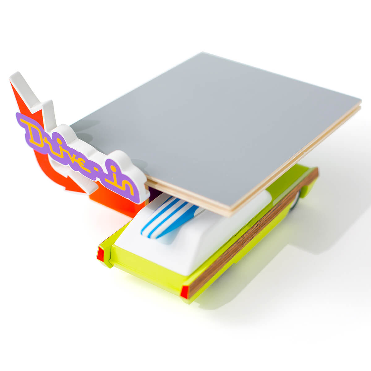 Drive In playset by Candylab Toys. The Drive-In is one of Candylab's newest additions to take you down down memory lane. The Drive-In is sure to have you thinking back to classic movies and popcorn in the car. Designed to fit any of the 3 car lines: Classics, Juniors, and Candycars.