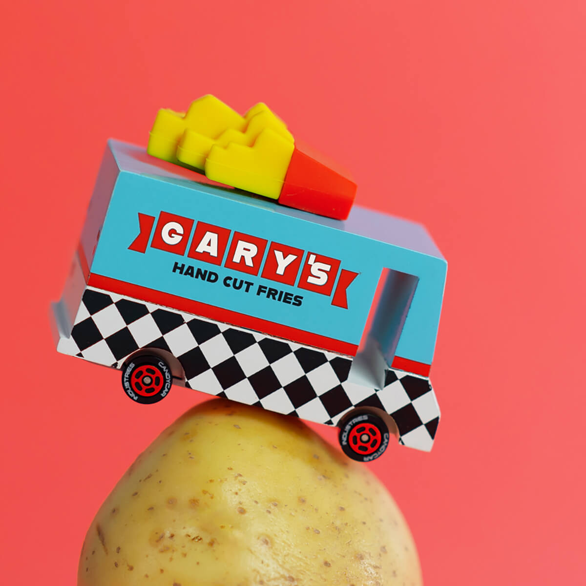 French Fry Van Mini Candyvan By Candylab Toys. We always felt our Patty’s Hamburger Van was missing something… a side of fries! Our French Fry Van is finally here, dishing out fresh hand cut fries for all to enjoy. Complete with a silicone topper shaped like Gary's signature fries, this van looks ready to dip into your imaginary sauce of choice.