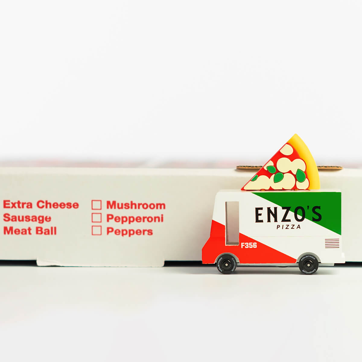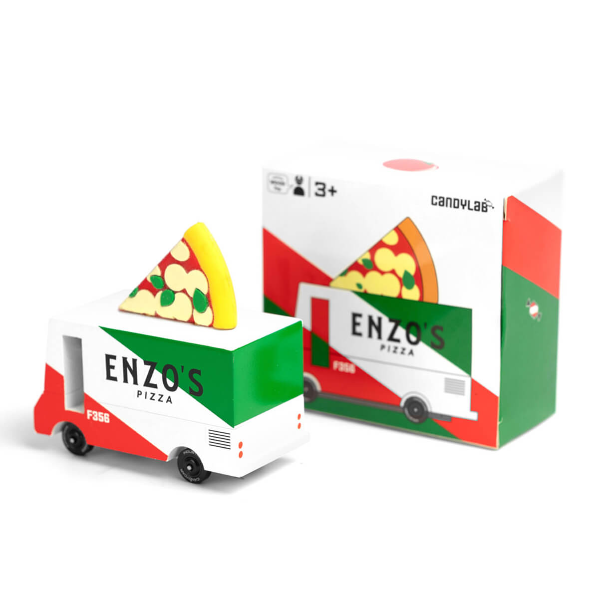Pizza Van Mini Candyvan By Candylab Toys. Pepperoni, Hawaiian, or just plain cheese – this new Pizza Van is cooking up the best pies in the Candycar World. Wood fired from a wooden van, Enzo’s can’t be beat. Try it for yourself!