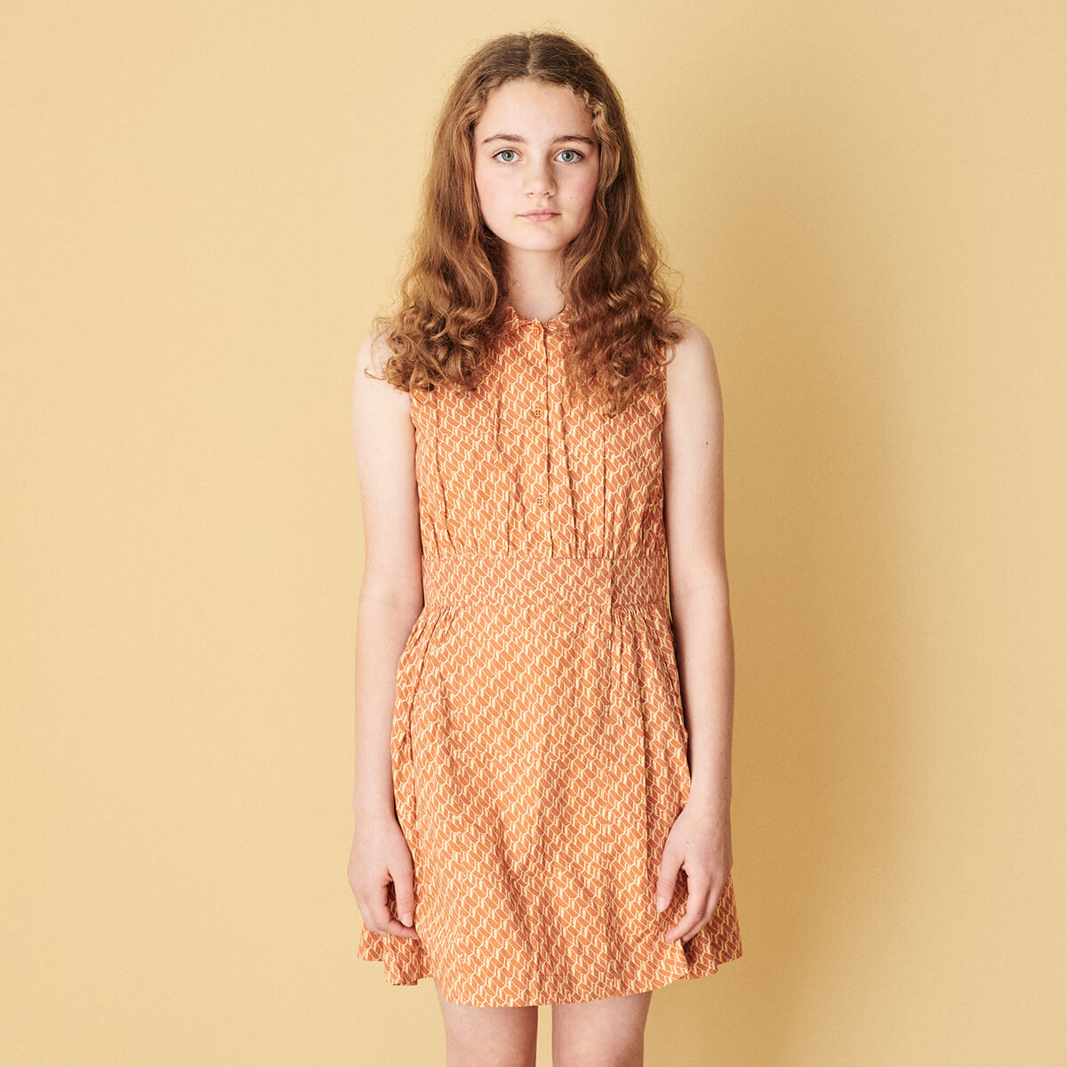 Penguin Dress by Caramel. Recalling the elegance of 50's design, Caramel's Penguin dress features a smart shirt collar and button-down bodice, with gathering at the waist, side pockets and pleats in the skirt to form a smart A-line silhouette. The geo print in a warm apricot adds a contemporary feel to this vintage-inspired style.