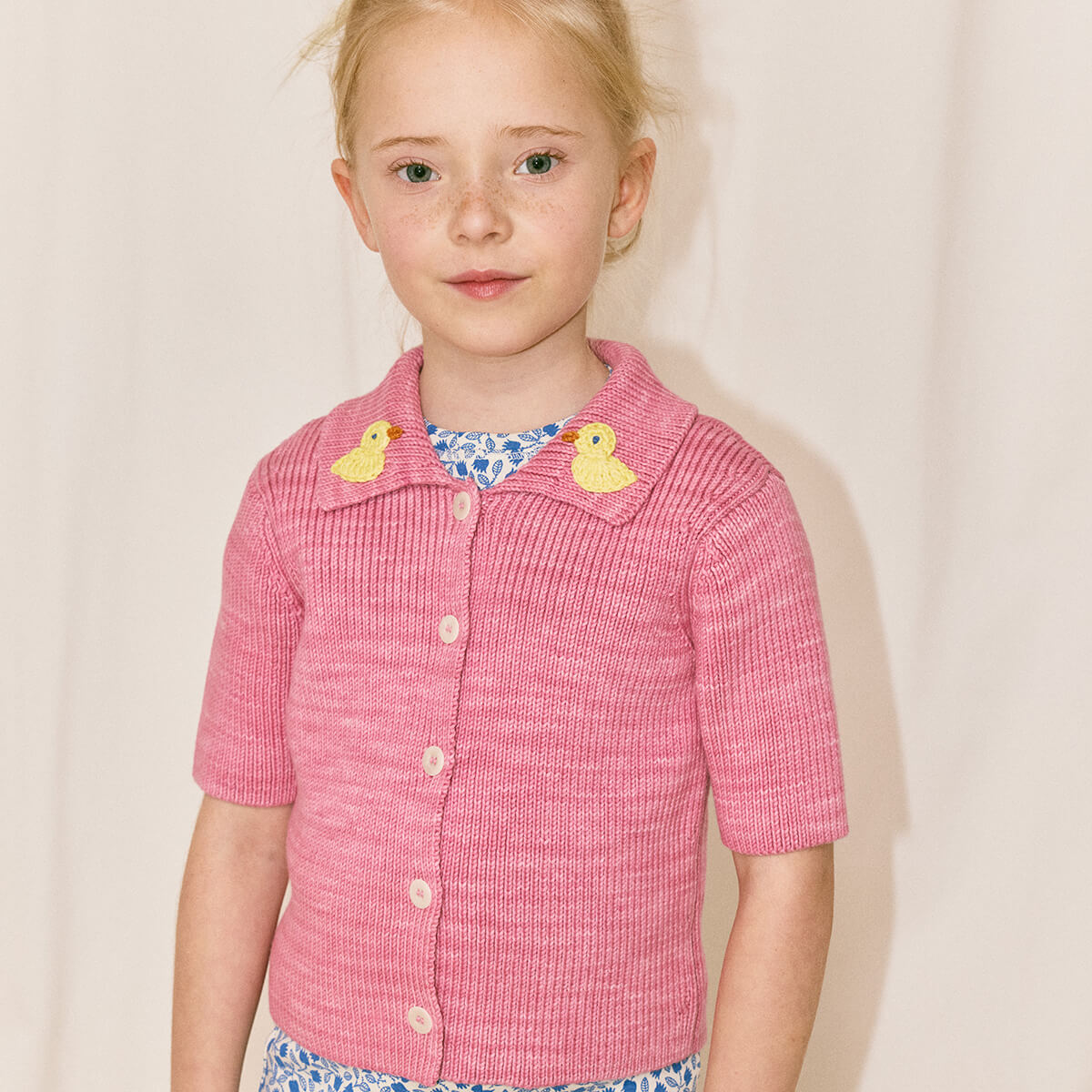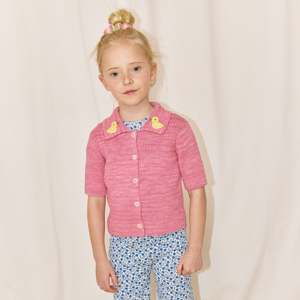 Duckling Cafe Cardigan by Misha & Puff. A vintage-style short-sleeved cardigan in a Pima cotton knit, with a slim silhouette, point collar, and corozo button closure. Finished with hand-crocheted appliqué motifs on the collar.