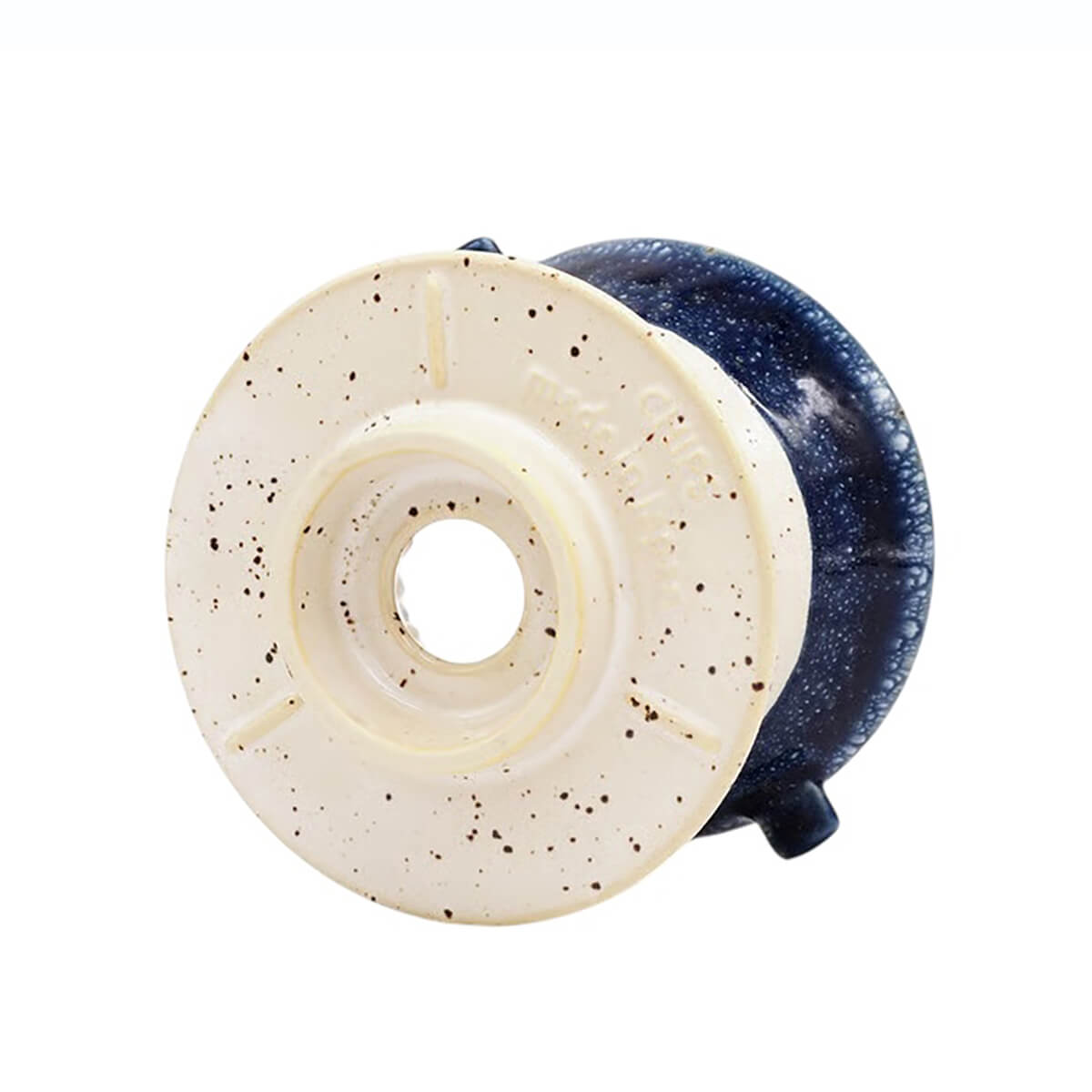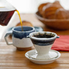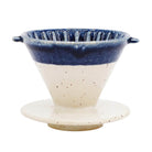 Chips Dripper in White & Navy by Chips Inc. This compact coffee dripper is designed to brew between one and two cups of coffee. It can sit over single mug or a small coffee pot. To use simply insert a small paper filter, add your preferred ground coffee, and gradually pour over hot water. The dripper is packaged in an elegant black cardboard box with the Chips Inc logo.