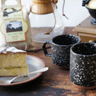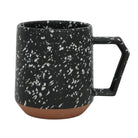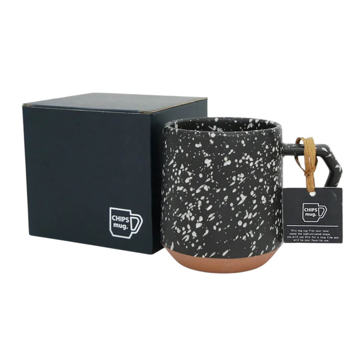 Chips Mug in Black & White by Chips Inc. This beautiful handmade mug has easy-to-hold grip with a unique, angled handle. Crafted in Japan from durable Mino porcelain, a celebrated traditional Japanese pottery. The splatter effect glaze makes each mug unique. It features an unglazed, earthy clay base that contrasts with the vibrant glaze, showcasing the fine texture of the red clay used by Mino artisans. The mug is packaged in an elegant black cardboard box with the Chips Inc logo.