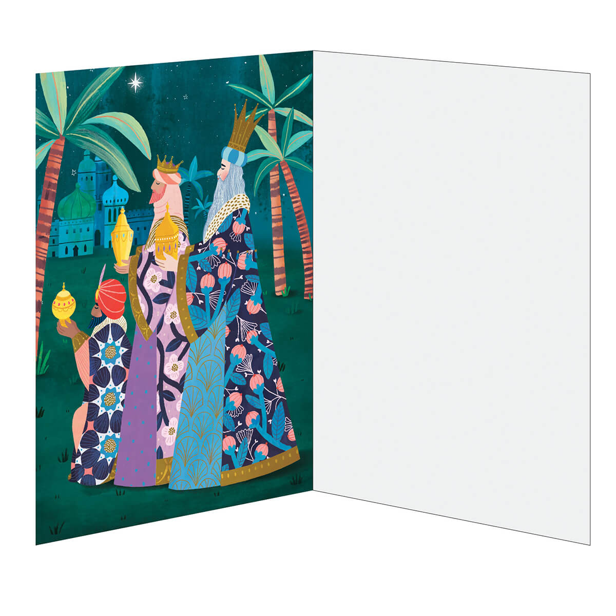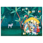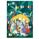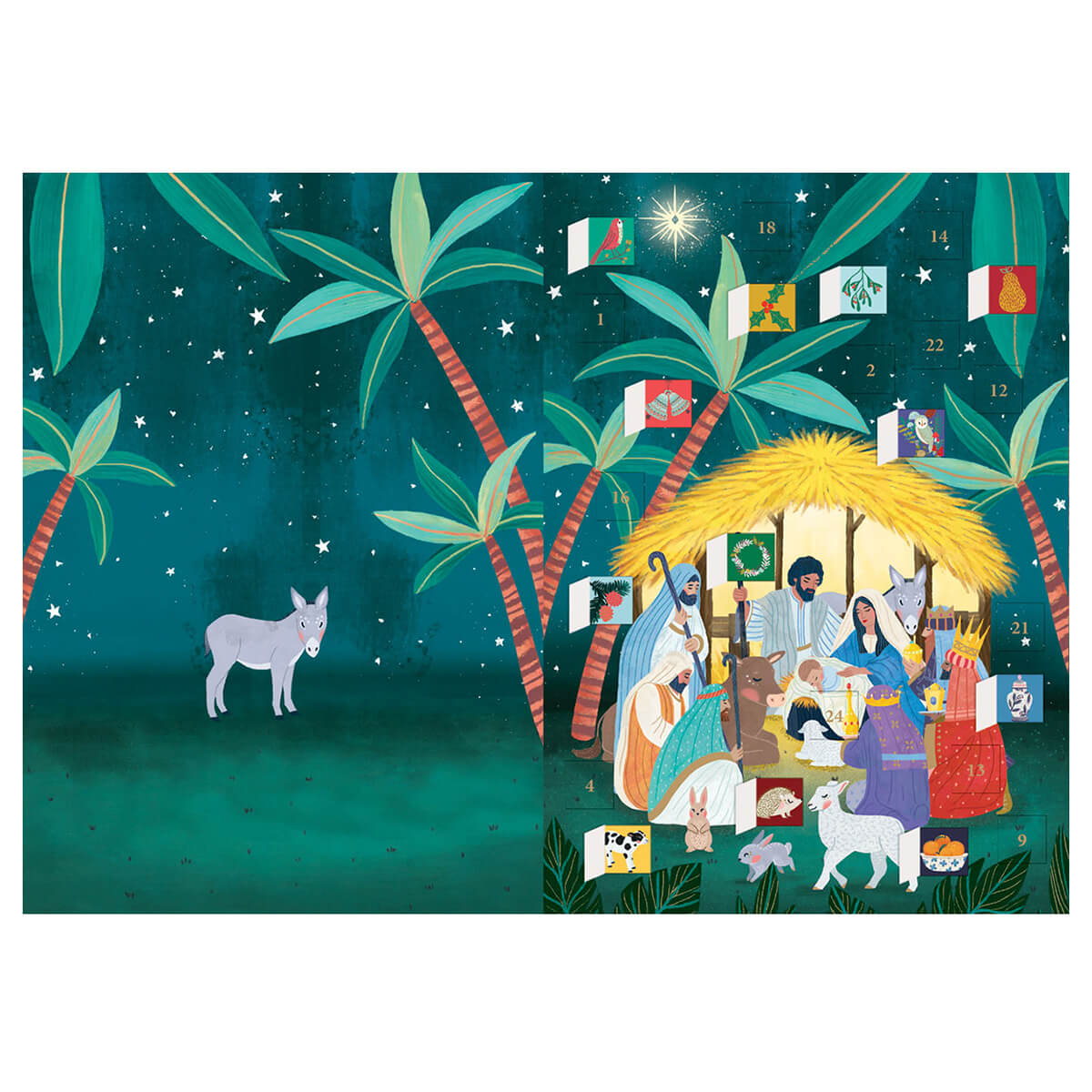 Away in a manger advent calendar greetings card by Roger La Borde. Features artwork by Antoana Oreski. 24 die-cut windows on the front of the card reveal hidden images.