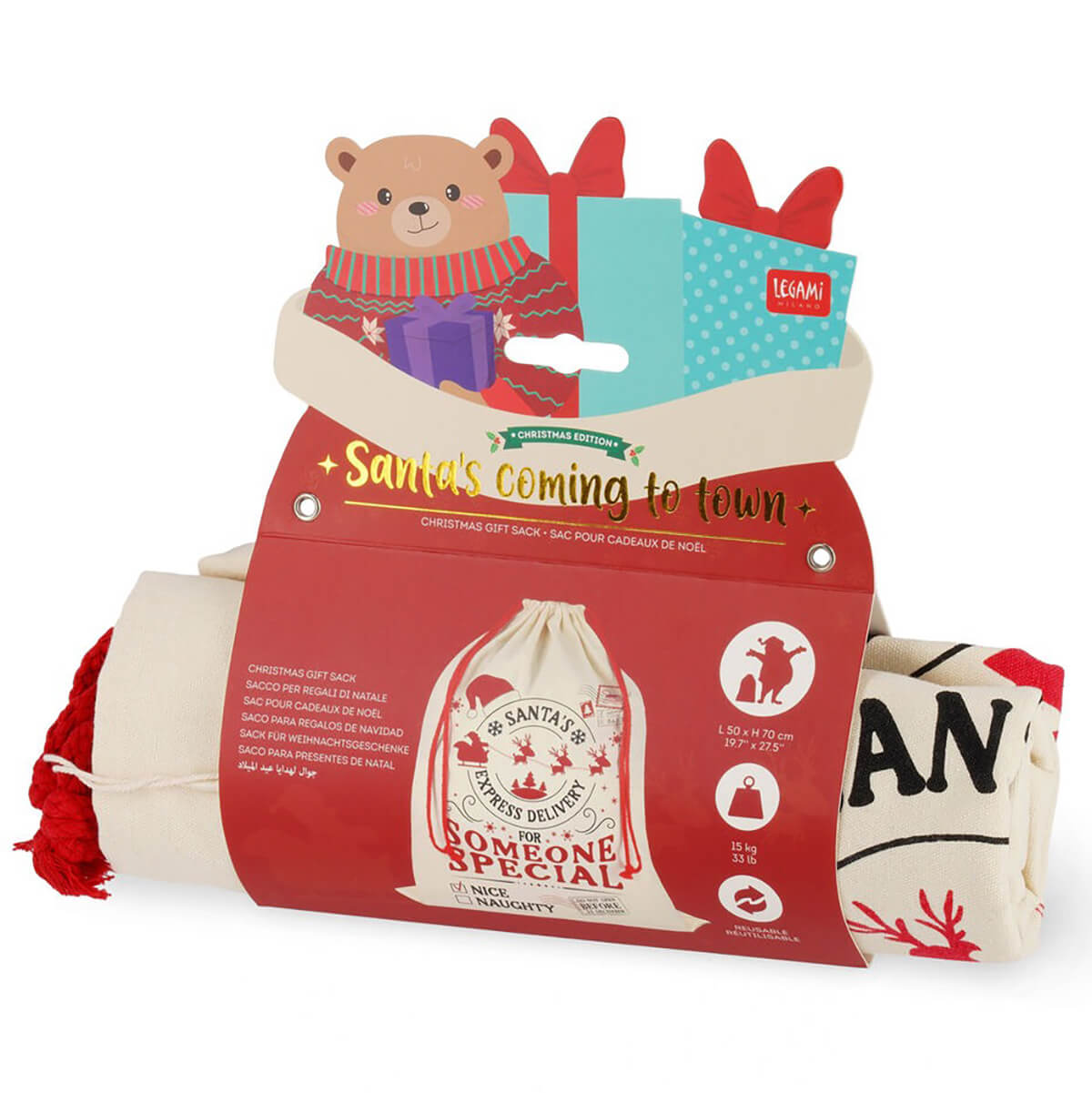 Christmas Gift Sack by Legami. A super-roomy, super-sturdy Santa's Coming to Town Christmas gift sack. All you have to do is make sure it's super full too! Machine washable with a drawstring closure.