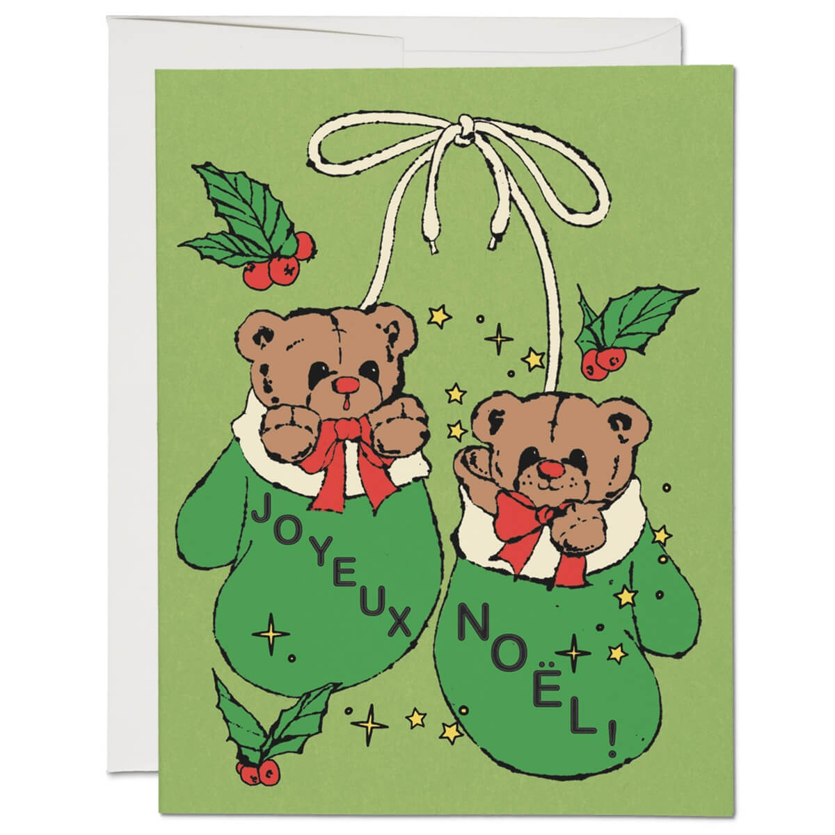 Mitten Bears holiday greetings card by Red Cap Cards. Features an illustration by Hannah-Michelle Bayley. Printed in the USA on heavyweight card stock. Blank inside with white envelope.