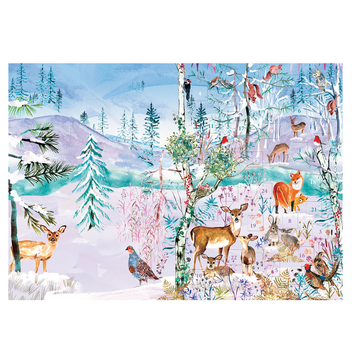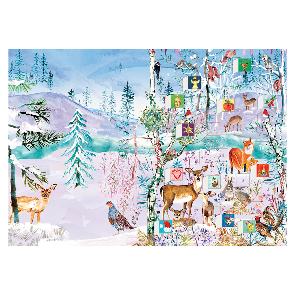 Wild Winter's Song advent calendar greetings card by Roger La Borde. Features artwork by Fay Ford. 24 die-cut windows on the front of the card reveal hidden images.
