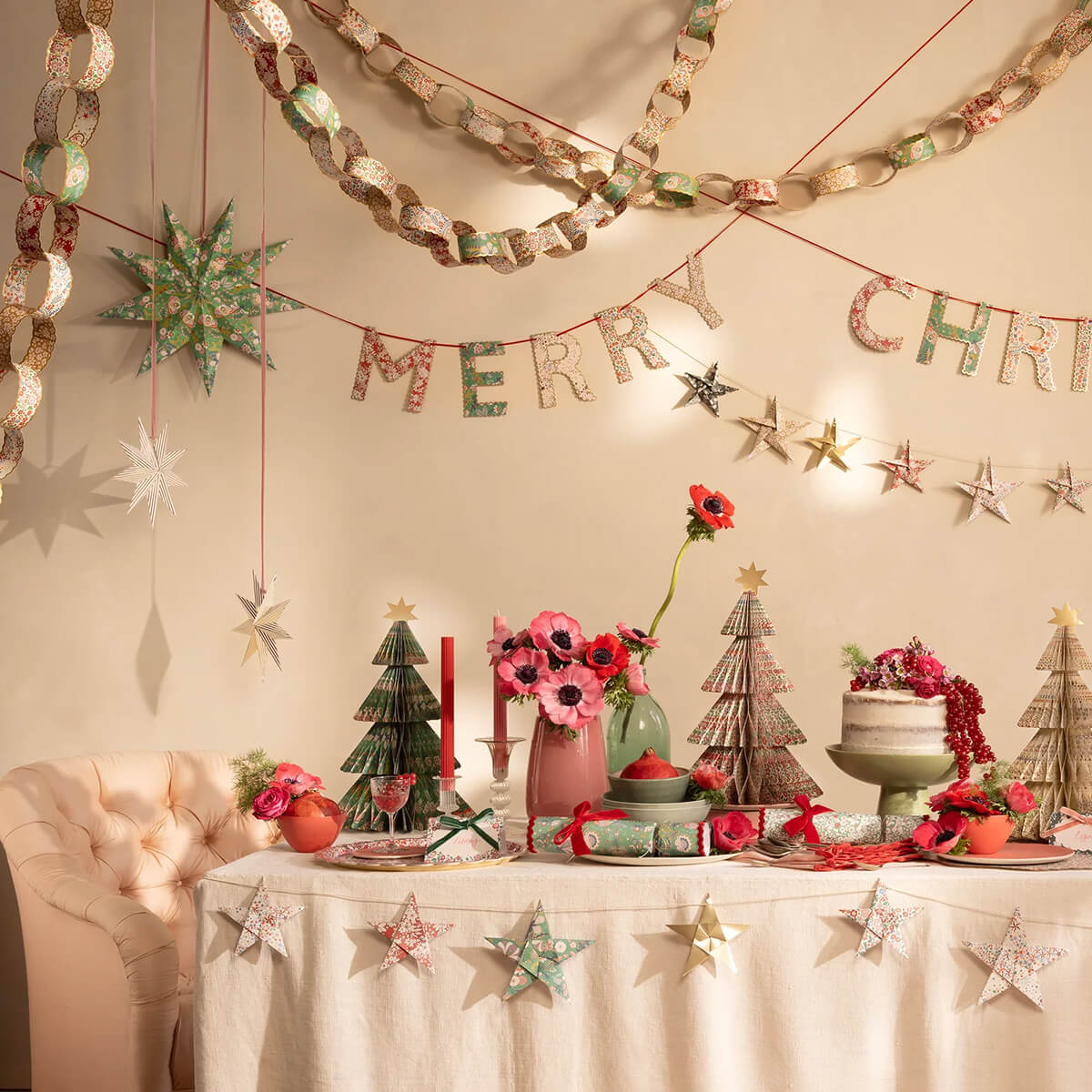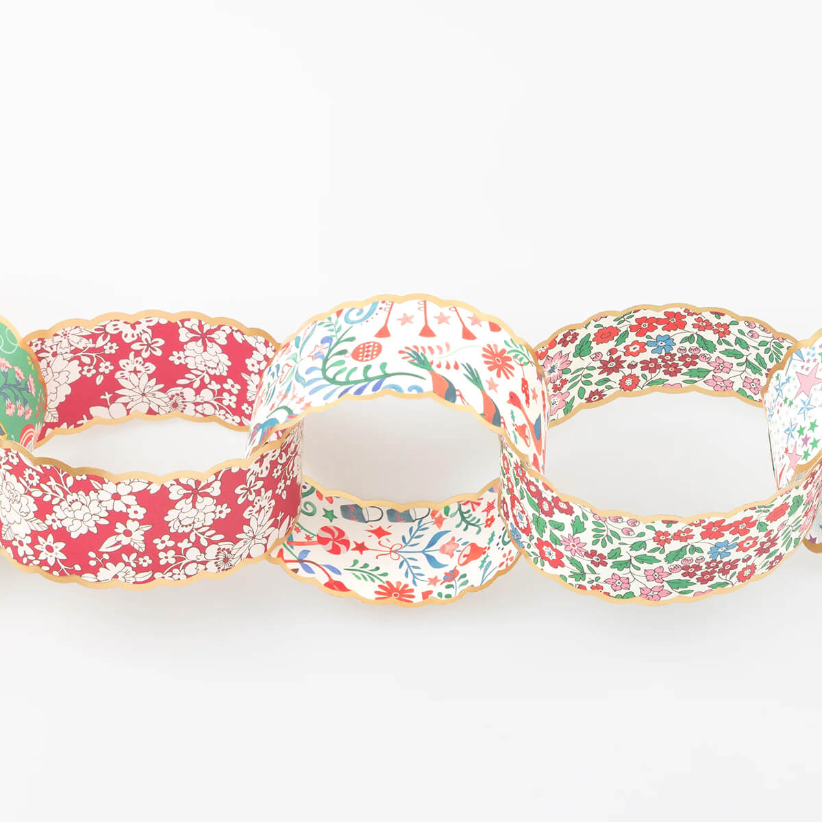Liberty Paper Chains Set by Meri Meri. Meri Meri have collaborated with Liberty to bring a touch of elegance to your Christmas decor. This stylish scalloped paper chain garland, featuring Liberty floral and star prints in joyful festive hues and pale matt gold foil accents, blends playful charm with sophistication. What's more, the whole family will love joining in to loop these oversized, chic chains together. Perfect for your porch, doorway, wall, mantel, window or to drape on your party table. When the celebrations are over, simply pack away, then reuse year after year. Driven by discovery, Liberty has been home to the artistic shopper since 1875. Famed for its directional design and celebration of craftsmanship, its prints are created in the heart of London by the Liberty design studio.
