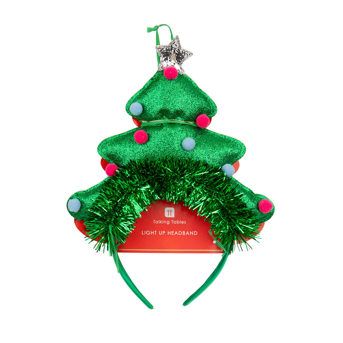 Green LED Christmas Tree Headband by Talking Tables. A showstopping novelty headband for all, this LED Christmas Tree Headband will be the talk of the party. This light up headwear is designed to be worn for many Christmases, an investment of joy.