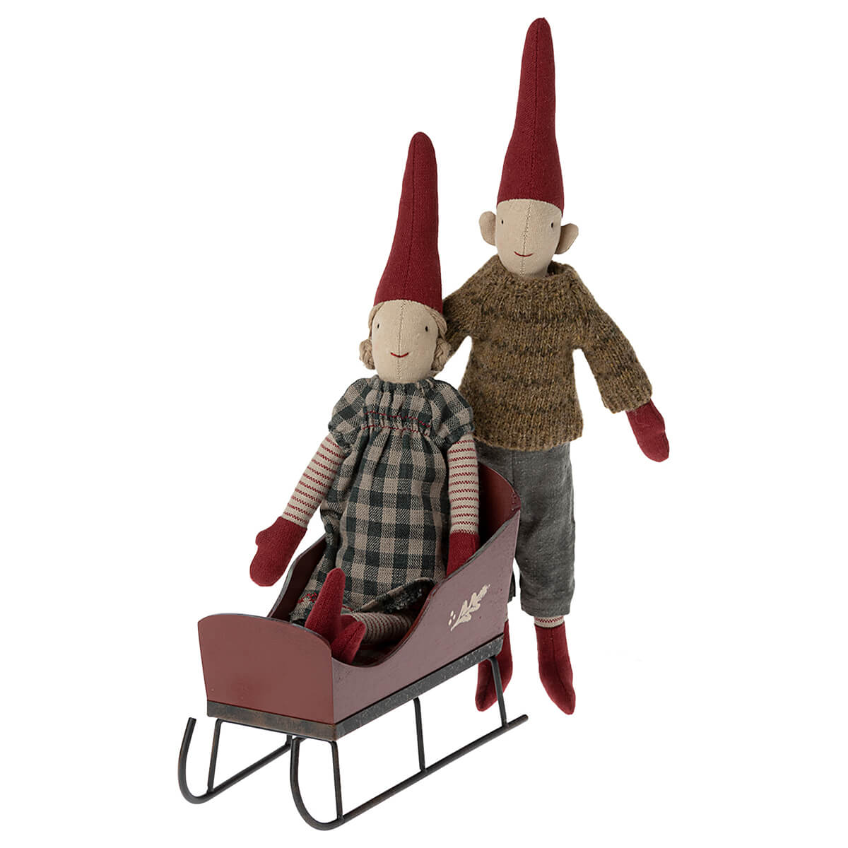 Mini Sleigh by Maileg. A lovely sleigh with a soft mattress to keep the passengers warm and comfortable during the ride. This sleigh fits the climbing and mini pixies perfectly. It has beautiful handpainted details - variation may occur.