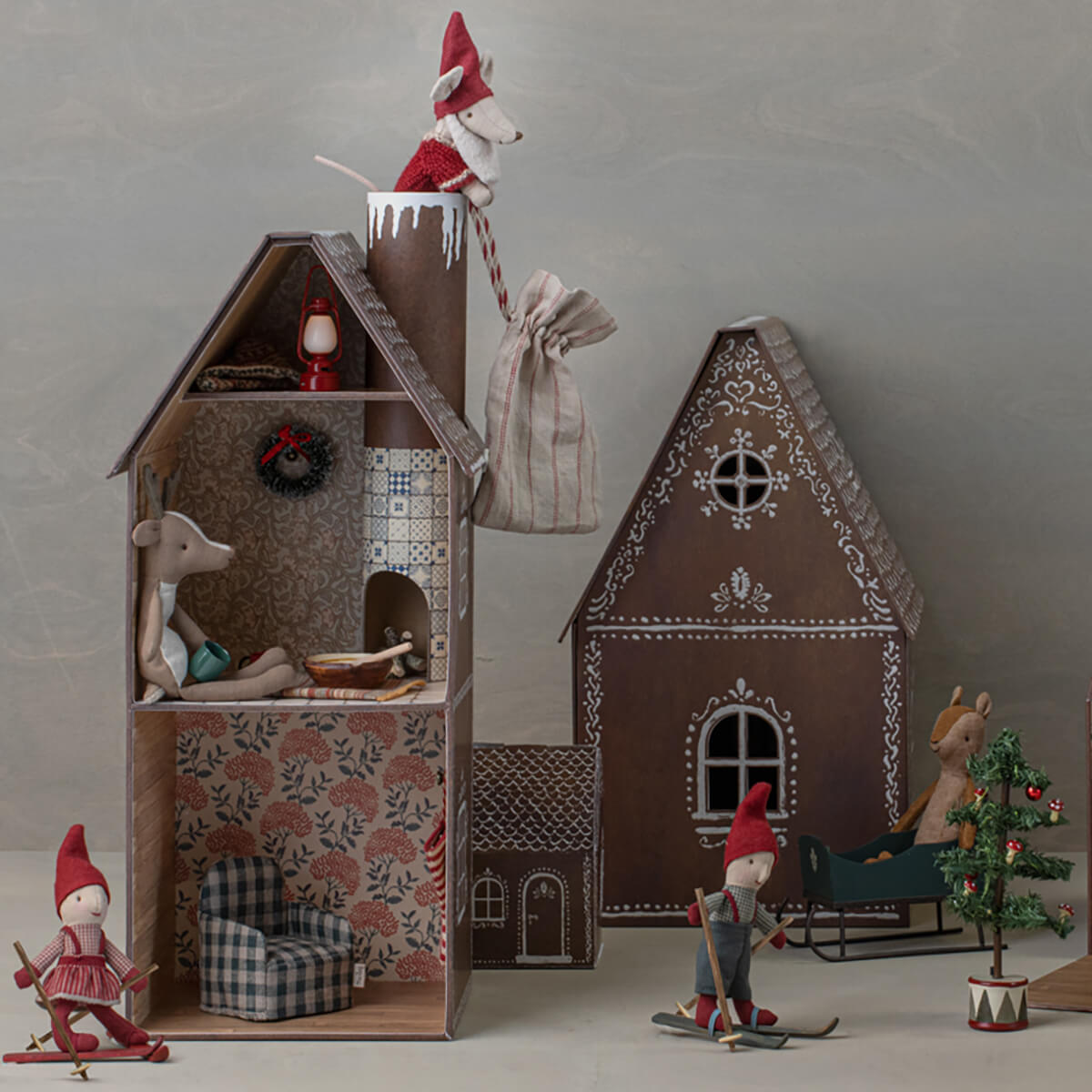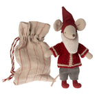 Santa Mouse by Maileg. Big brother mouse dressed in classic santa clothes. He lives in a small house, and has a sack for all the presents he has to deliver on Christmas night. He fits perfectly into the bigger Maileg Gingerbread house as he can slide through the chimney!