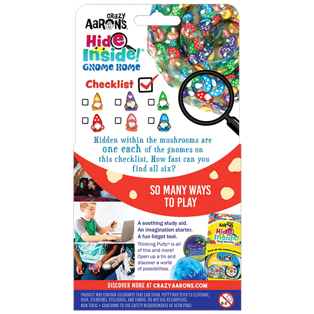 Hide Inside Gnome Home Thinking Putty by Crazy Aarons. Gnome Home Thinking Putty is where the heart is! How quickly can you forage through the cluster of colorful mushrooms to find the 6 hidden gnomes? If you look close enough you'll always find what you are looking for. This firm putty has a clear base with with small clay pieces inside. Stretch it, bounce it, pop it, tear it, and sculpt it!