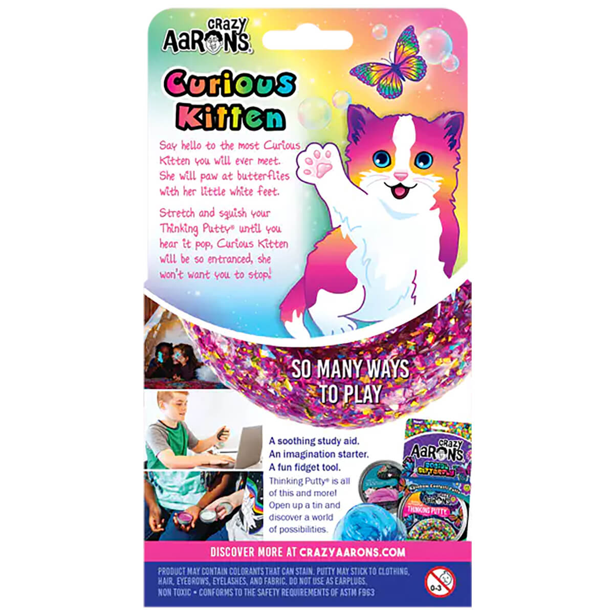 Putty Pets Curious Kitten Trendsetters Thinking Putty by Crazy Aarons. Say hello to the most curious kitten you will ever meet. She will paw at butterflies with her little white feet. Stretch and squish your Thinking Putty® until you hear it pop, Curious Kitten will be so entranced, she won't want you to stop! Pink putty with multicolour sparkly glitter inspired by a kitten chasing an rainbow coloured butterfly. Stretchable and sculptable with a soft texture.