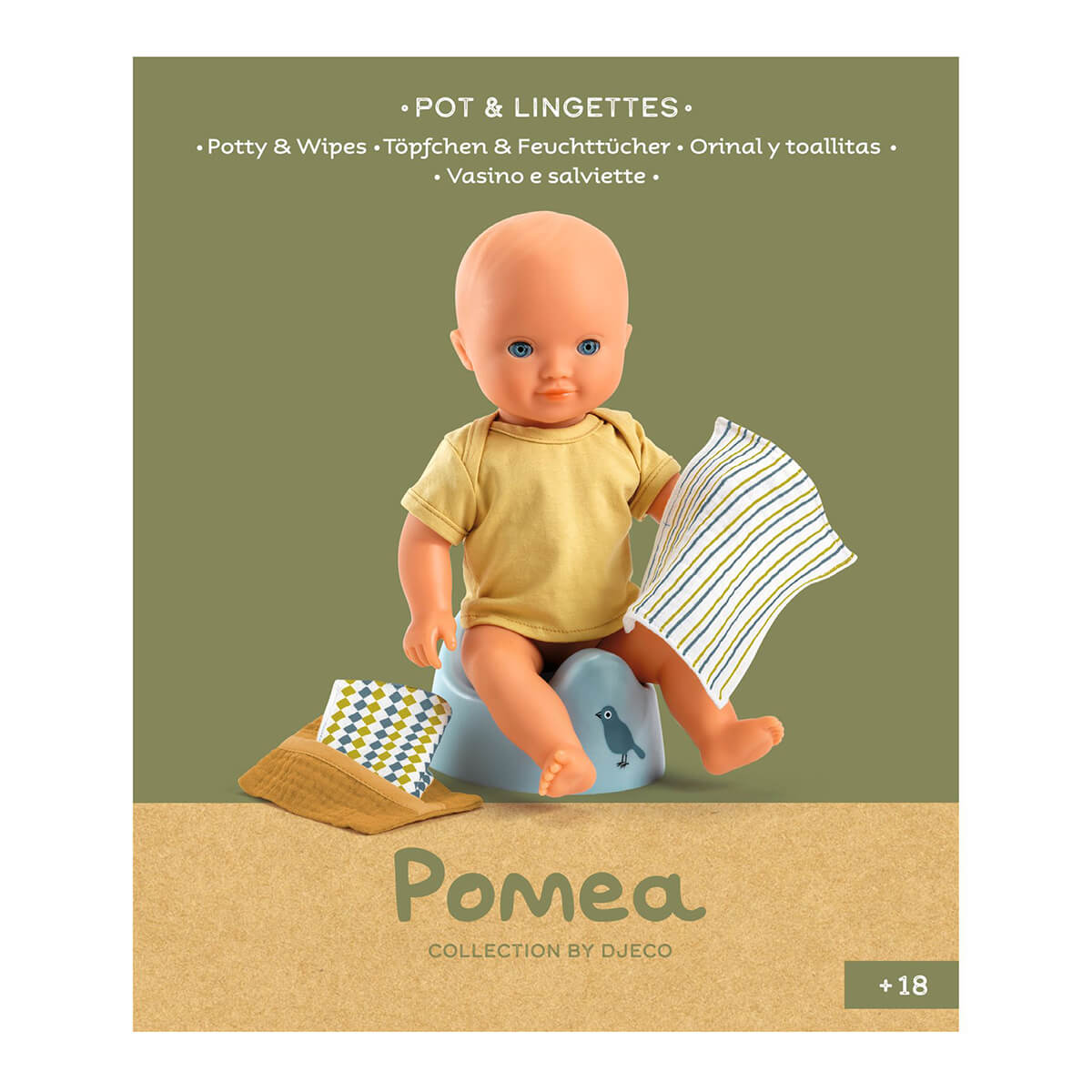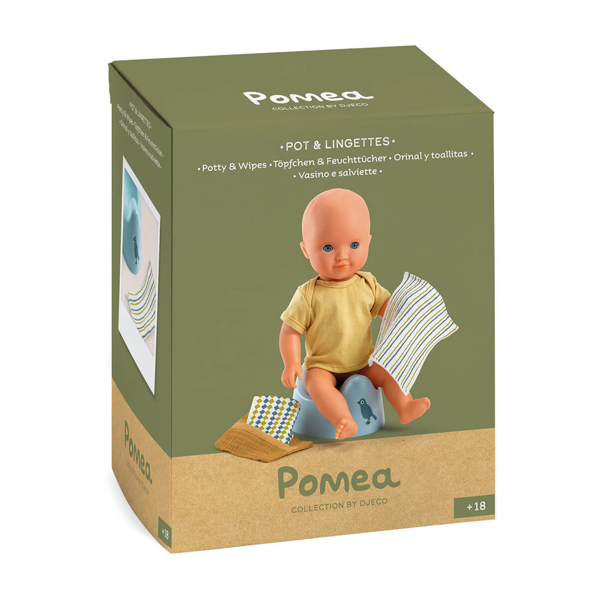 Pomea Potty & Wipes Set by Djeco. A potty and a case with two soft double gauze fabric wipes: essential accessories for your doll's first steps towards cleanliness! Suitable for baby dolls from 30 to 36 cm.